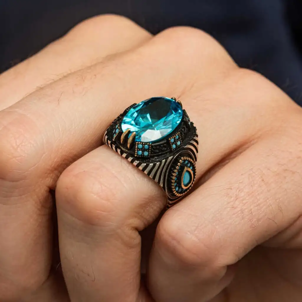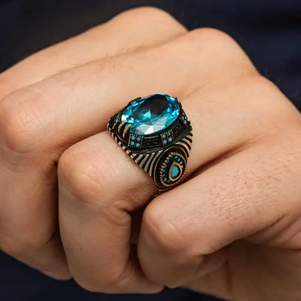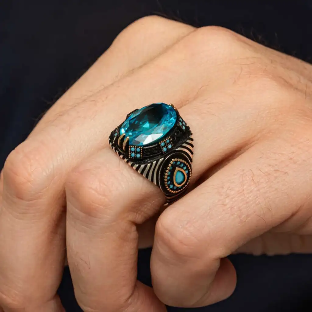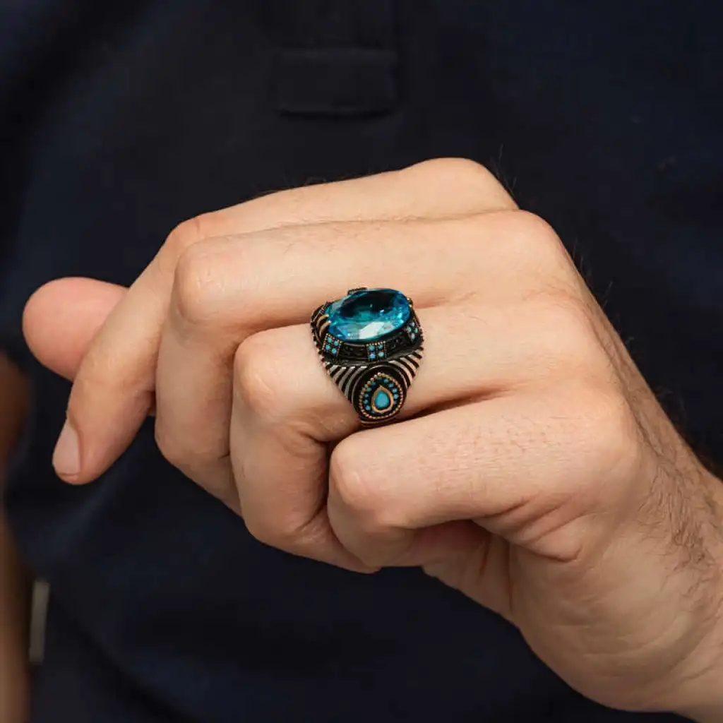 Gümüş malzemeden yapılmış,mavi fasetli taşa sahip erkek yüzük.Gür ve gösterişli tasarımıyla dikkat çekiyor.Büyük ve parlak taşın büyüleyici efekti,yüzüğe şıklık ve tarz katarken,detaylı tasarımıyla özgünlük ve güç sembolü oluyor.Hem günlük kullanıma hem de özel davetlerde dikkat çekici bir aksesuar arayan erkekler için ideal tercih.Kişisel tarzınıza modern ve özgün bir dokunuş sağlar.Üzerindeki detaylar ve taşların parlaklığıyla tarzınıza şıklık katacak bir aksesuar.Bu yüzük,hem casual hem de şık kombinlerle uyum sağlayabilir.Gümüş üzerine oksit kaplama yapılmıştır.Oksit kaplama yapılan gümüş erkek yüzük modelleri parlaklığını uzun süre muhafaza eder, oksitlenmesi gecikir. Gümüş ve değerli taşlar nedeniyle belirtilen ortalama ürün ağırlığında ± %10 sapma olabilmektedir.