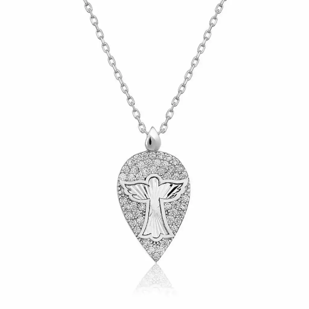Takıda en çok tercih edilen formlardan biri olan melek sembolleri, en güzel dilekleri, şansı, iyiliği ve ümit etmeyi ifade ediyor. Şifadan bilgeliğe, sevgiden berekete pek çok dileği sembolize eden melek damla bayan kolye modelleri, gerek görünümlerindeki şıklık, gerekse taşıdıkları anlam ile size ve sevdiklerinize şans getirecek. Kolye, 925 ayar gümüşten imal edilmiştir. Gümüş üzerine rodyum kaplama yapılmıştır. Rodyum kaplama yapılan gümüş kolye modelleri parlaklığını uzun süre muhafaza eder ve oksitlenmesi gecikir. Zincir boyu ortalama 45 cm'dir. Tüm gümüş bayan kolyelerde olduğu gibi bu gümüş melek damla bayan kolye modelinin de tamamı el emeği ile üretilmiştir. Gümüş ve değerli taşlar nedeniyle belirtilen ortalama ürün ağırlığında ± %10 sapma olabilmektedir.