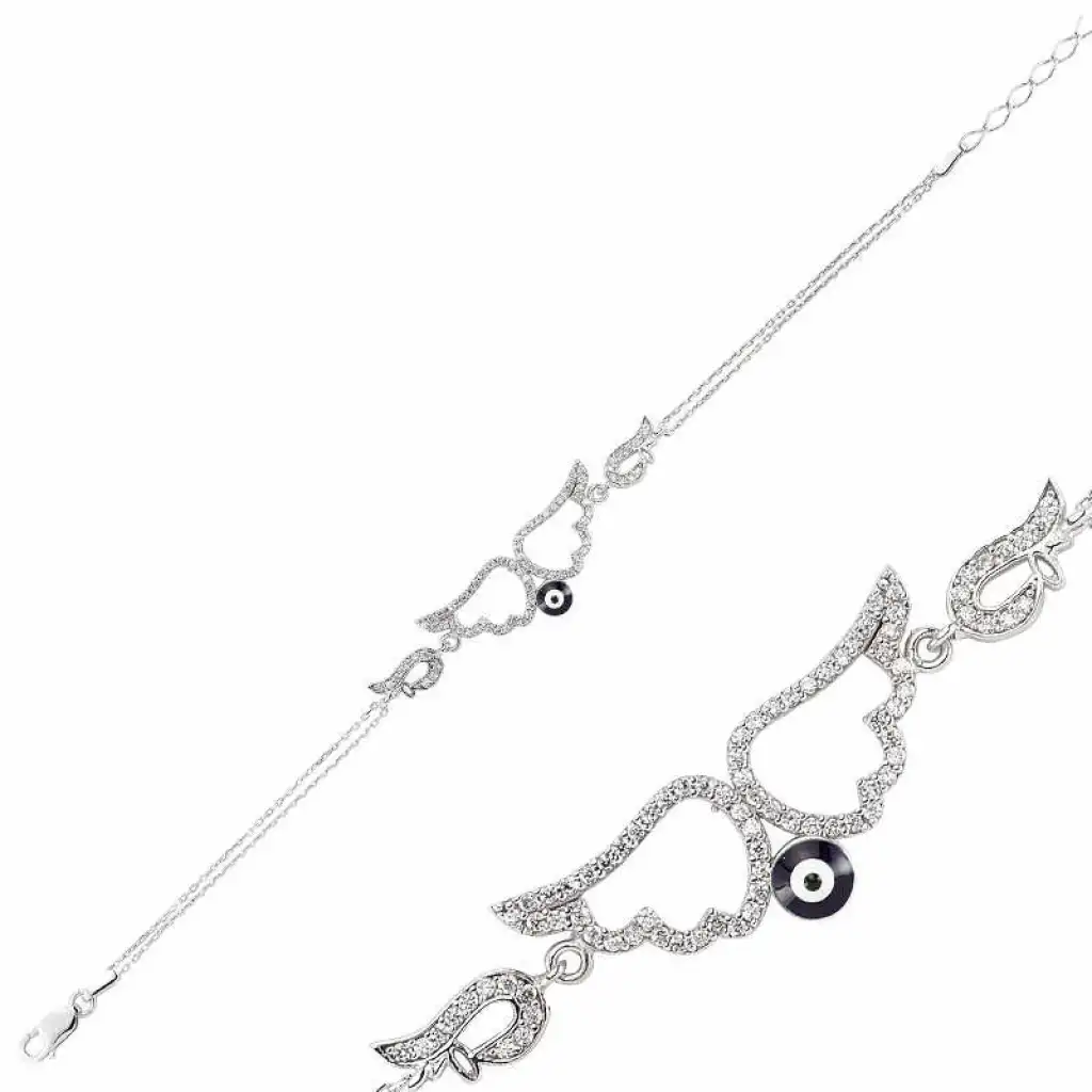Melekler saflığın ve temizliğin simgeleridir. Bu bileklik hediye edilen kişiye melek kadar saf ve temiz olduğu mesajı verilmektedir... Bu şık bileklik; doğum günü hediyesi, sevgililer günü hediyesi veya annelere hediye olarak özel günlerde tercih edilebilecek mükemmel bir seçenektir. Bu özel melek kanadı tasarımı 925 ayar gümüşten imal edilmiştir... Tasarım melek kanadı bayan bileklik üzerinde bulunan taşlar zirkondur. Bu bayan gümüş bileklik modeli üzerine rodyum kaplama yapılmıştır. Rodyum kaplama yapılan gümüş bayan bileklik modelleri parlaklığını uzun süre muhafaza eder, oksitlenmeyi geciktirir. Tüm gümüş bileklikler modellerinde olduğu gibi bu gümüş melek kanadı bayan bileklik modeli de el emeği ile üretilmiştir. Gümüş ve değerli taşlar nedeniyle belirtilen ortalama ürün ağırlığında ± %10 sapma olabilmektedir.
