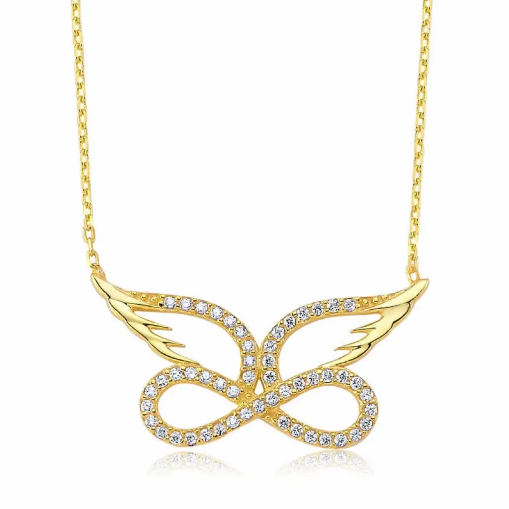 Sevgiliyi en çok mutlu eden hediyelerden biri de sonsuzluk sembollü kolye modelleridir, sonsuza dek sürmesini dilediğiniz aşkınızı, tutkunuzu ve sadakatinizi ifade eder. Melek kanadı ise saflığın, temizliğin simgeleri ve koruyucu anlamı nedeni ile de son derece hoş bir hediye seçeneği olarak öne çıkmaktadır.Bu nedenle gümüş melek kanadı sonsuzluk bayan kolyesi hediye edilen kişiye melek kadar saf ve temiz olduğunu sonsuza kadar sevileceğini ifade etmektedir. Sizin olduğu kadar sevdiklerinizin de keyifle takacağı gümüş melek kanadı sonsuzluk bayan kolye sevgiliye en güzel hediyelerden biri olacaktır. Bu özel tasarım kolye 925 ayar gümüşten üretilmiştir. Gümüş üzerinde altın kaplama vardır. Altın kaplama yapılan tüm gümüş bayan kolye modelleri parlaklığını uzun süre muhafaza eder. Tüm bayan kolye modellerinde olduğu gibi gümüş melek kanadı sonsuzluk bayan kolye de el emeği ile üretilmiştir.Gümüş ve değerli taşlar nedeniyle belirtilen ürün ağırlığında ± %10 sapma olabilmektedir.