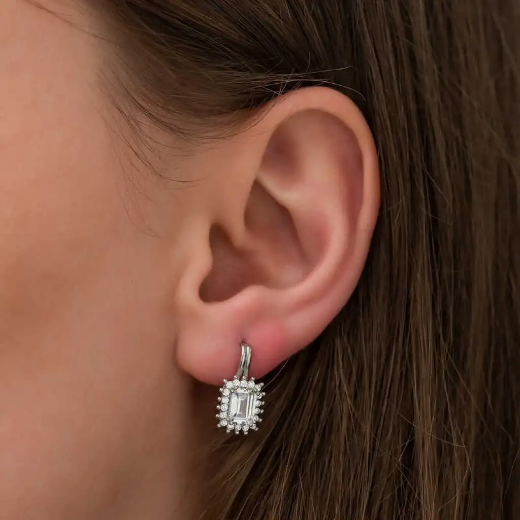 Gümüş rodyum kaplama mengeçli zümrüt kesim küpe, günün her anında severek kullanılabilecek spor ve klasik her konsepte uyum sağlayan aksesuarlardandır. Mengeçli zümrüt kesim bayan küpe 925 ayar gümüşten imal edilmiştir. Gümüş üzerine rodyum kaplama yapılmıştır. Rodyum kaplama yapılan gümüş mengeçli zümrüt kesim küpe modelleri parlaklığını uzun süre muhafaza eder, oksitlenmesi gecikir. Üzerinde bulunan taşlar zirkondur. Gümüş küpe modellerinin tamamında olduğu gibi gümüş mengeçli zümrüt kesim bayan küpe modeli de el emeği ile üretilmiştir. Gümüş ve değerli taşlar nedeniyle belirtilen ortalama ürün ağırlığında ± %10 sapma olabilmektedir.