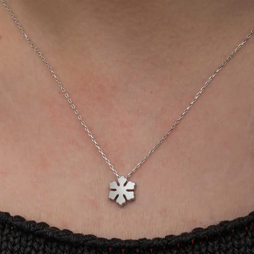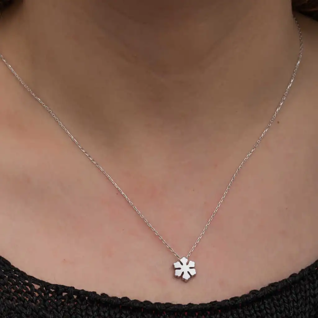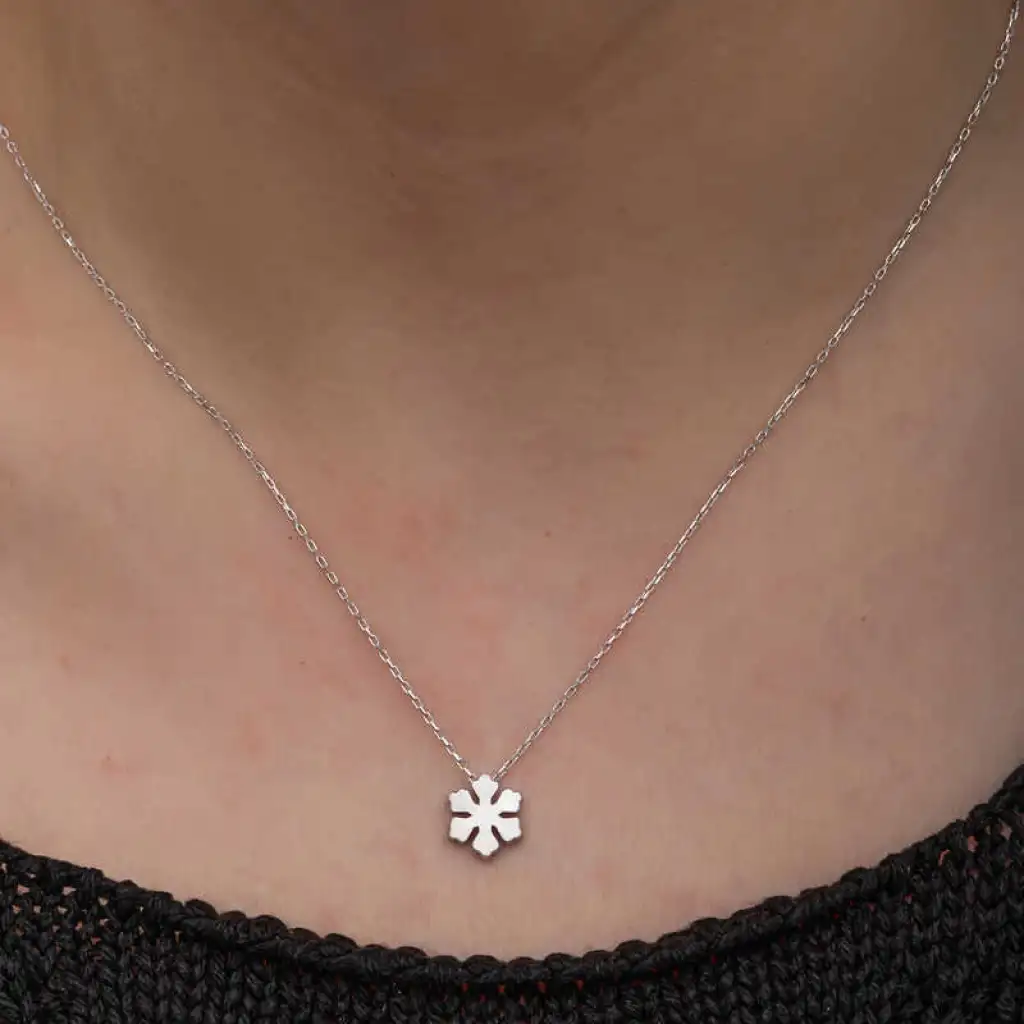 Kadınların ışıltısı, berraklığı kar tanesine benzetilip özel olarak tasarlanmıştır. Kar tanelerinin her birinin kadınlar gibi eşsiz ve ayrı kıymette olması onları özel kılan bir diğer özelliktir. Asilliği her dönemde dikkat çekmeyi başarmıştır. Bunun yanında insanların tıpkı kar taneleri gibi birbirlerine zarar vermeden de mutlu bir şekilde yaşayabileceklerini sembolize etmektedir. Bu şık kolye; doğum günü hediyesi, sevgililer günü hediyesi veya annelere hediye olarak özel günlerde tercih edilebilecek mükemmel bir seçenektir. Kolye, 925 ayar gümüşten imal edilmiştir. Gümüş üzerine rodyum kaplama yapılmıştır. Rodyum kaplama yapılan gümüş kadın kolye modelleri parlaklığını uzun süre muhafaza eder, oksitlenmesi gecikir. Zincir boyu ortalama 45 cm'dir. Tüm gümüş kadın kolye modellerinde olduğu gibi bu gümüş minimal kar tanesi kadın kolye de tamamı el emeği ile üretilmiştir. Gümüş ve değerli taşlar nedeniyle belirtilen ortalama ürün ağırlığında ± %10 sapma olabilmektedir.