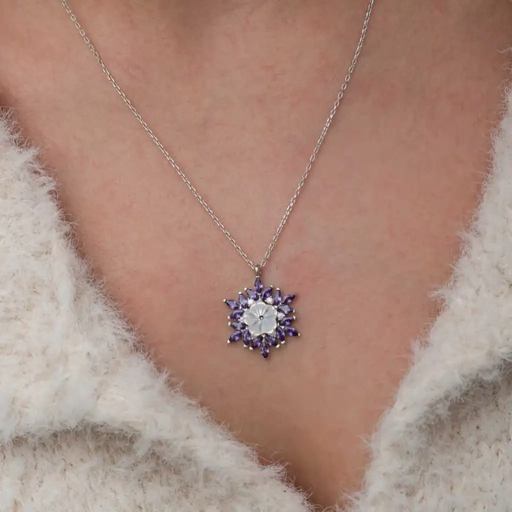 Gümüş Mor Lotus Desenli Çiçek Kadın Kolye