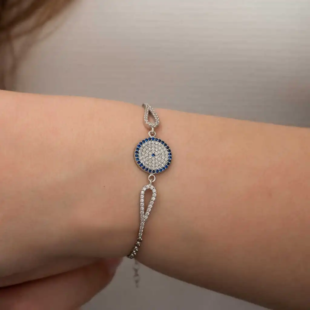 Nazar boncuğunu insanlar uzun yıllardan beri kötü bakıştan korunmak için kullanmışlardır. Kötü bakışların insanlar üzerinde olumsuz etki oluşturmasına karşı bir önlemdir, nazar boncuğu… Bu sebeptendir ki insanlar sevdiklerini korumak için nazar boncuğu takmaktadır. Bu nazar bileklik de şıklığı ve zarafeti yansıtıyor. Her dönem sevilen ve şıklığından ödün vermeyen bu modeli; doğum günü hediyesi, sevgililer günü hediyesi veya annelere hediye olarak özel günlerde tercih edebilirsiniz. Gümüş nazar bayan bileklik, 925 ayar gümüşten imal edilmiştir. Gümüş üzerine rodyum kaplama yapılmıştır. Rodyum kaplama yapılan gümüş bayan bileklikler parlaklığını uzun süre muhafaza eder, oksitlenmesi gecikir. Üzerinde bulunan taşlar zirkondur. Tüm gümüş bayan bilekliklerinde olduğu gibi bu gümüş nazar boncuklu bayan bileklik modeli de tamamı el emeği ile üretilmiştir. Gümüş ve değerli taşlar nedeniyle belirtilen ortalama ürün ağırlığında ± %10 sapma olabilmektedir.