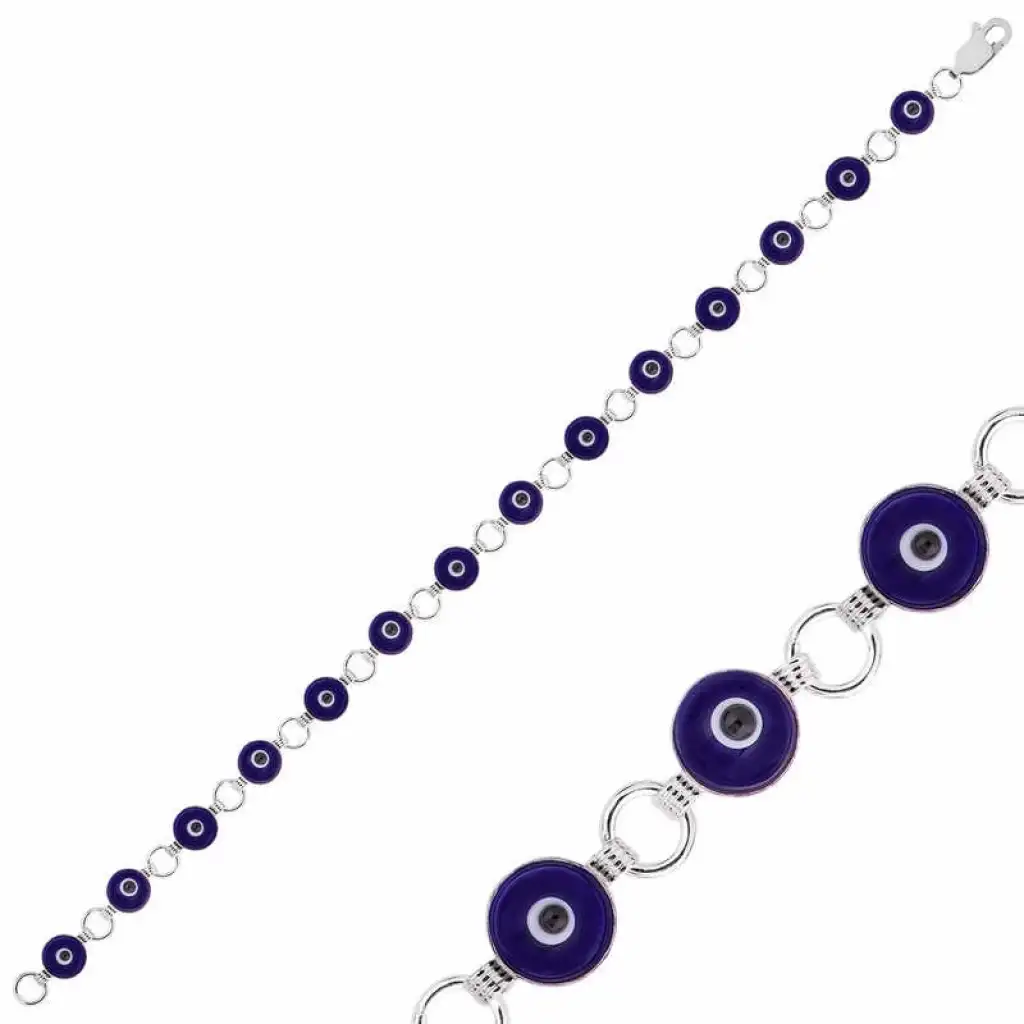 Nazar boncuğunu insanlar uzun yıllardan beri kötü bakıştan korunmak için kullanmışlardır. Kötü bakışların insanlar üzerinde olumsuz etki oluşturmasına karşı bir önlemdir nazar boncuğu… Bu sebeptendir ki insanlar sevdiklerini korumak için nazar boncuğu takmaktadır. Bu nazar bileklik de şıklığı ve zarafeti yansıtıyor. Her dönem sevilen ve şıklığından ödün vermeyen bu modeli; doğum günü hediyesi, sevgililer günü hediyesi veya annelere hediye olarak özel günlerde tercih edebilirsiniz. Gümüş nazar bayan bileklik, 925 ayar gümüşten imal edilmiştir. Gümüş üzerine rose kaplama yapılmıştır. Rose kaplama yapılan gümüş bayan bileklikler parlaklığını uzun süre muhafaza eder, gümüşü pembe renge çevirir ve oksitlenmesi gecikir. Üzerinde bulunan taşlar firuze ve zirkondur. Tüm gümüş bayan bilekliklerinde olduğu gibi bu gümüş nazar bayan bileklik modeli de tamamı el emeği ile üretilmiştir. Gümüş ve değerli taşlar nedeniyle belirtilen ortalama ürün ağırlığında ± %10 sapma olabilmektedir.
