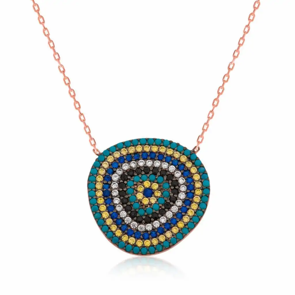 Nazar boncuğunu insanlar uzun yıllardan beri kötü bakıştan korunmak için kullanmışlardır. Kötü bakışların insanlar üzerinde olumsuz etki oluşturmasına karşı bir önlemdir nazar boncuğu. Bu sebeptendir ki insanlar sevdiklerini korumak için nazar boncuğu takmaktadır. Bu nazar kolye de şıklığı ve zarafeti yansıtıyor. Her dönem sevilen ve şıklığından ödün vermeyen bu modeli; doğum günü hediyesi, sevgililer günü hediyesi veya annelere hediye olarak özel günlerde tercih edebilirsiniz. Gümüş nazar bayan kolye, 925 ayar gümüşten imal edilmiştir. Gümüş kolye üzerine rose kaplama yapılmıştır. Rose kaplama yapılan bayan kolyeler parlaklığını uzun süre muhafaza eder, gümüş rengini pembe renge dönüştürür ve oksitlenmeyi geciktirir. Zincir boyu ortalama 45 cm'dir. Tüm gümüş bayan kolye modellerinde olduğu gibi bu gümüş nazar bayan kolye modeli de tamamı el emeği ile üretilmiştir. Gümüş ve değerli taşlar nedeniyle belirtilen ortalama ürün ağırlığında ± %10 sapma olabilmektedir.