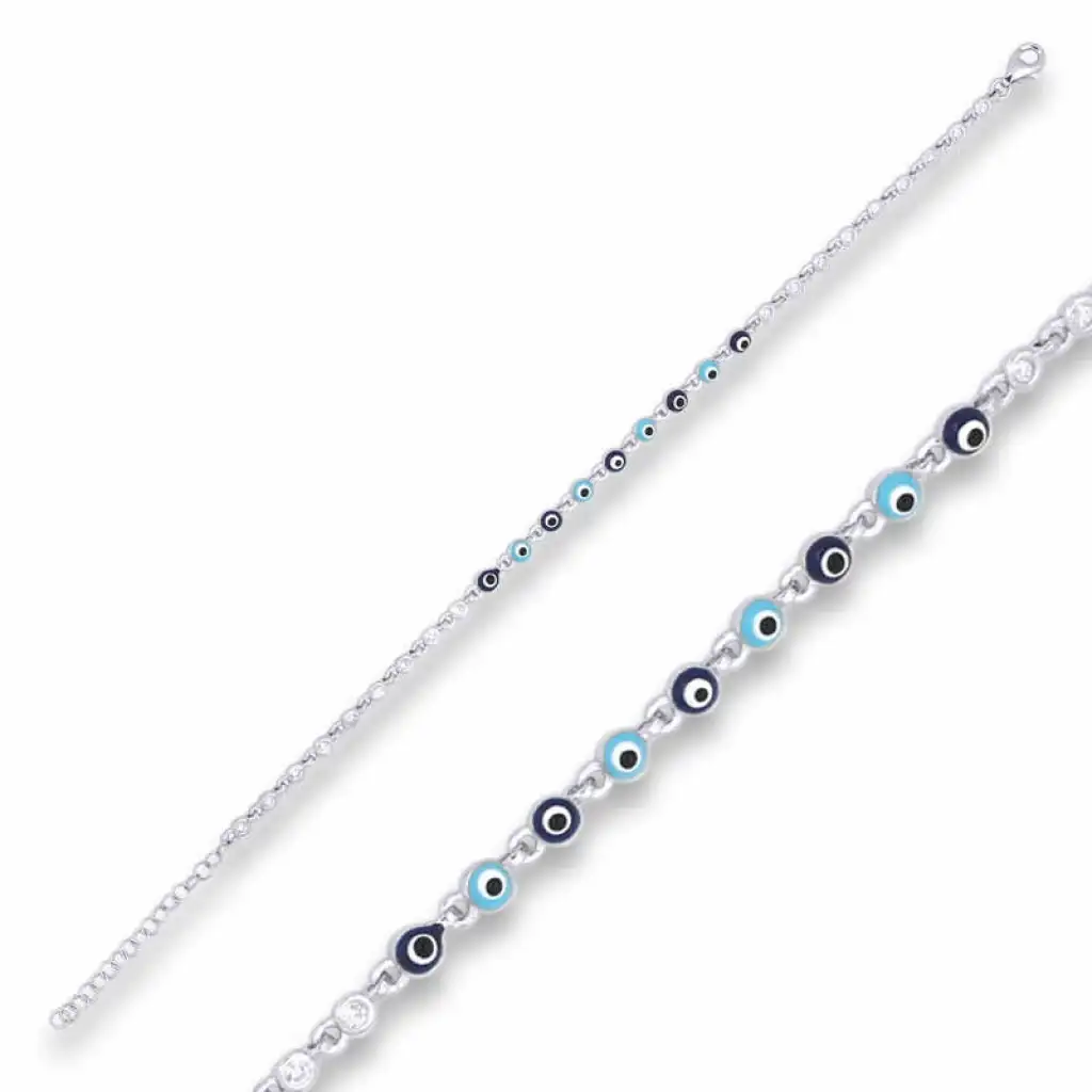 Nazar boncuğunu insanlar uzun yıllardan beri kötü bakıştan korunmak için kullanmışlardır. Kötü bakışların insanlar üzerinde olumsuz etki oluşturmasına karşı bir önlemdir, nazar boncuğu… Bu sebeptendir ki insanlar sevdiklerini korumak için nazar boncuğu takmaktadır. Bu nazar boncuklu bileklik de şıklığı ve zarafeti yansıtıyor. Her dönem sevilen ve şıklığından ödün vermeyen bu modeli; doğum günü hediyesi, sevgililer günü hediyesi veya annelere hediye olarak özel günlerde tercih edebilirsiniz. Gümüş nazar bayan bileklik, 925 ayar gümüşten imal edilmiştir. Gümüş üzerine rodyum kaplama yapılmıştır. Rodyum kaplama yapılan gümüş bayan bileklikler parlaklığını uzun süre muhafaza eder, oksitlenmesi gecikir. Üzerinde bulunan taşlar zirkondur. Tüm gümüş bayan bilekliklerinde olduğu gibi bu gümüş nazar boncuklu bayan bileklik modeli de tamamı el emeği ile üretilmiştir. Gümüş ve değerli taşlar nedeniyle belirtilen ortalama ürün ağırlığında ± %10 sapma olabilmektedir.