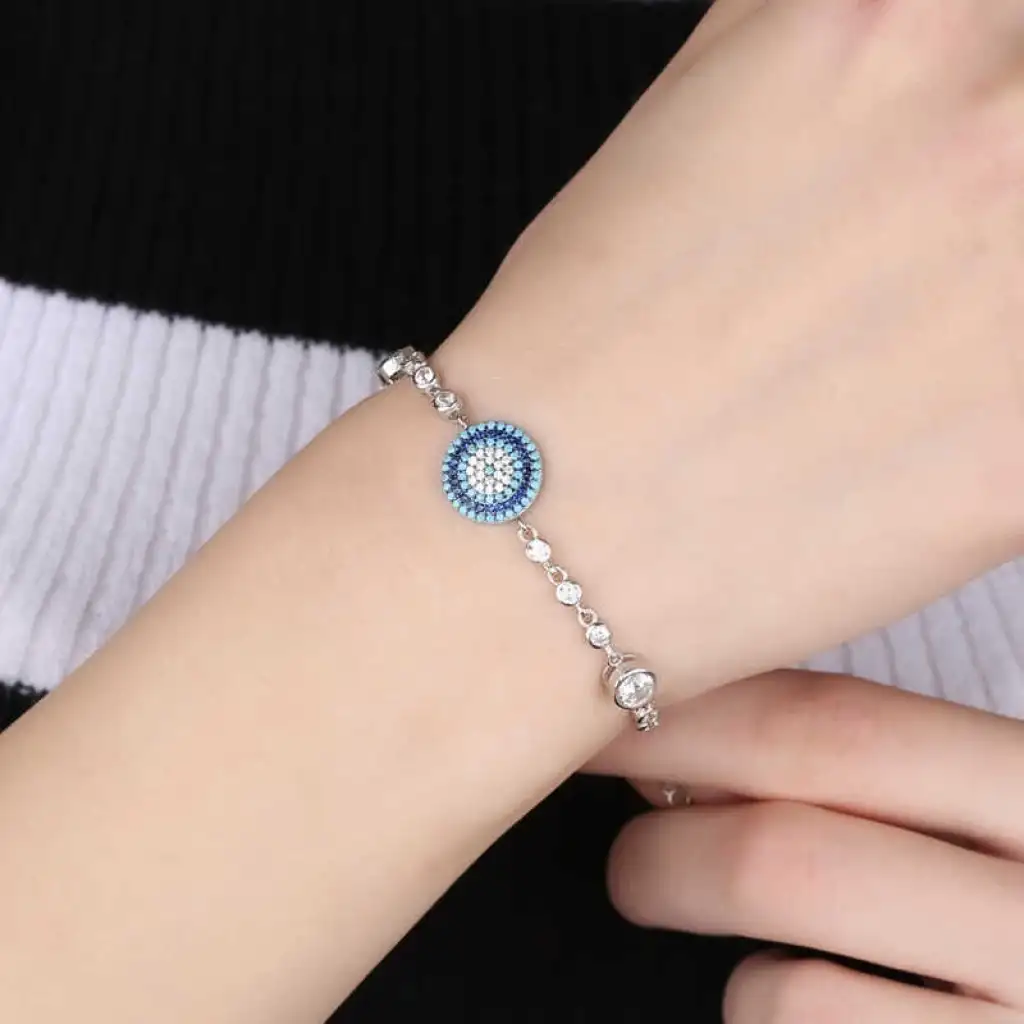 Nazar boncuğunu insanlar uzun yıllardan beri kötü bakıştan korunmak için kullanmışlardır. Kötü bakışların insanlar üzerinde olumsuz etki oluşturmasına karşı bir önlemdir, nazar boncuğu… Bu sebeptendir ki insanlar sevdiklerini korumak için nazar boncuğu takmaktadır. Bu nazar boncuklu bileklik de şıklığı ve zarafeti yansıtıyor. Her dönem sevilen ve şıklığından ödün vermeyen bu modeli; doğum günü hediyesi, sevgililer günü hediyesi veya annelere hediye olarak özel günlerde tercih edebilirsiniz. Gümüş nazar bayan bileklik, 925 ayar gümüşten imal edilmiştir. Gümüş üzerine rodyum kaplama yapılmıştır. Rodyum kaplama yapılan gümüş bayan bileklikler parlaklığını uzun süre muhafaza eder, oksitlenmesi gecikir. Üzerinde bulunan taşlar zirkondur. Tüm gümüş bayan bilekliklerinde olduğu gibi bu gümüş nazar boncuklu bayan bileklik modeli de tamamı el emeği ile üretilmiştir. Gümüş ve değerli taşlar nedeniyle belirtilen ortalama ürün ağırlığında ± %10 sapma olabilmektedir.
