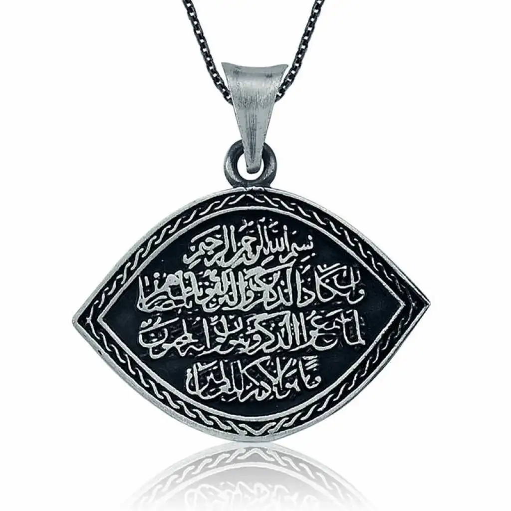 Nazar bakış demektir ve her canlıya nazar değebilmektedir. Bu nazar hastalığından korunmak, şifa bulmak için nazar duası okunur. Bu maneviyatı yüksek kolye; doğum günü hediyesi, sevgililer günü hediyesi veya annelere hediye olarak özel günlerde tercih edilebilecek mükemmel bir seçenektir. Nazar duası kolye modeli 925 ayar gümüşten imal edilmiştir. Gümüş üzerine oksit kaplama yapılmıştır. Oksit kaplama yapılan gümüş kolyeler parlaklığını uzun süre muhafaza eder ve kararması gecikir. Tüm gümüş bayan kolyelerde olduğu gibi gümüş nazar duası bayan kolye de el emeği ile üretilmiştir. Gümüş ve değerli taşlar nedeniyle belirtilen ortalama ürün ağırlığında ± %10 sapma olabilmektedir.
