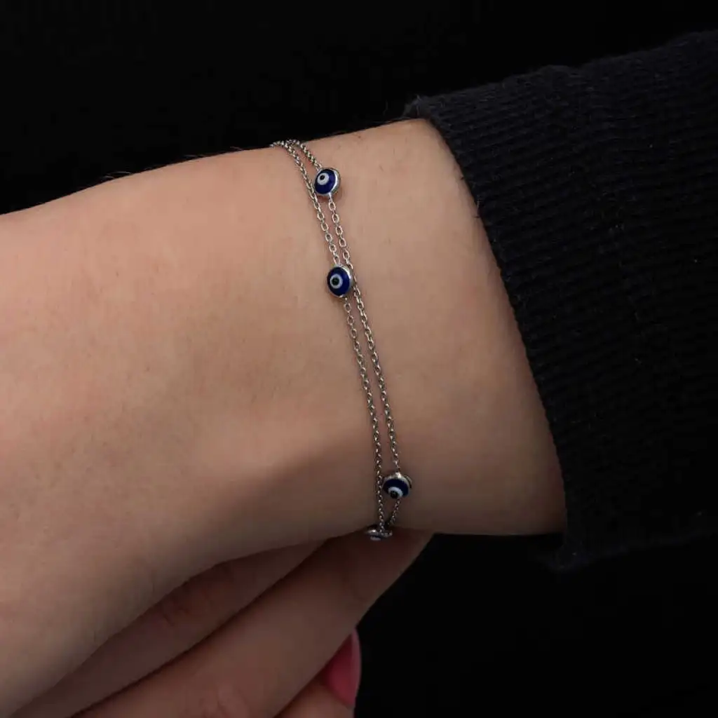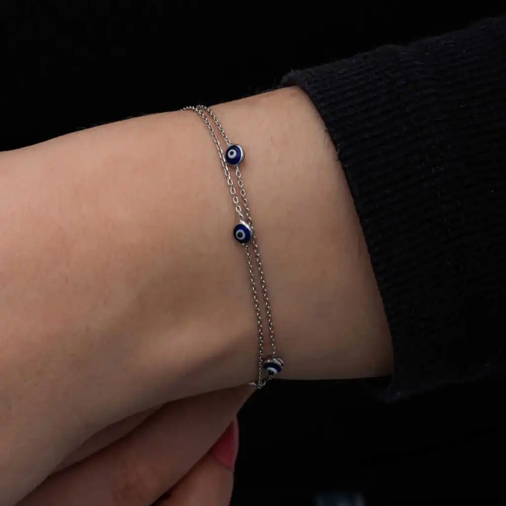 Nazar boncuğunu insanlar uzun yıllardan beri kötü bakıştan korunmak için kullanmışlardır. Kötü bakışların insanlar üzerinde olumsuz etki oluşturmasına karşı bir önlemdir nazar boncuğu… Bu sebeptendir ki insanlar sevdiklerini korumak için nazar boncuğu takmaktadır. Bu nazar bileklik de şıklığı ve zarafeti yansıtıyor. Nazar tasarımıyla göz alıcı şıklıkta... Her dönem sevilen ve şıklığından ödün vermeyen bu modeli; doğum günü hediyesi, sevgililer günü hediyesi veya annelere hediye olarak özel günlerde tercih edebilirsiniz. Nazar kadın bileklik, 925 ayar gümüşten imal edilmiştir. Gümüş üzerine rodyum kaplama yapılmıştır. Rodyum kaplama yapılan gümüş kadın bileklikler parlaklığını uzun süre muhafaza eder, oksitlenmesi gecikir. Tüm gümüş kadın bilekliklerinde olduğu gibi bu gümüş nazar kadın bileklik de tamamı el emeği ile üretilmiştir. Gümüş ve değerli taşlar nedeniyle belirtilen ortalama ürün ağırlığında ± %10 sapma olabilmektedir.