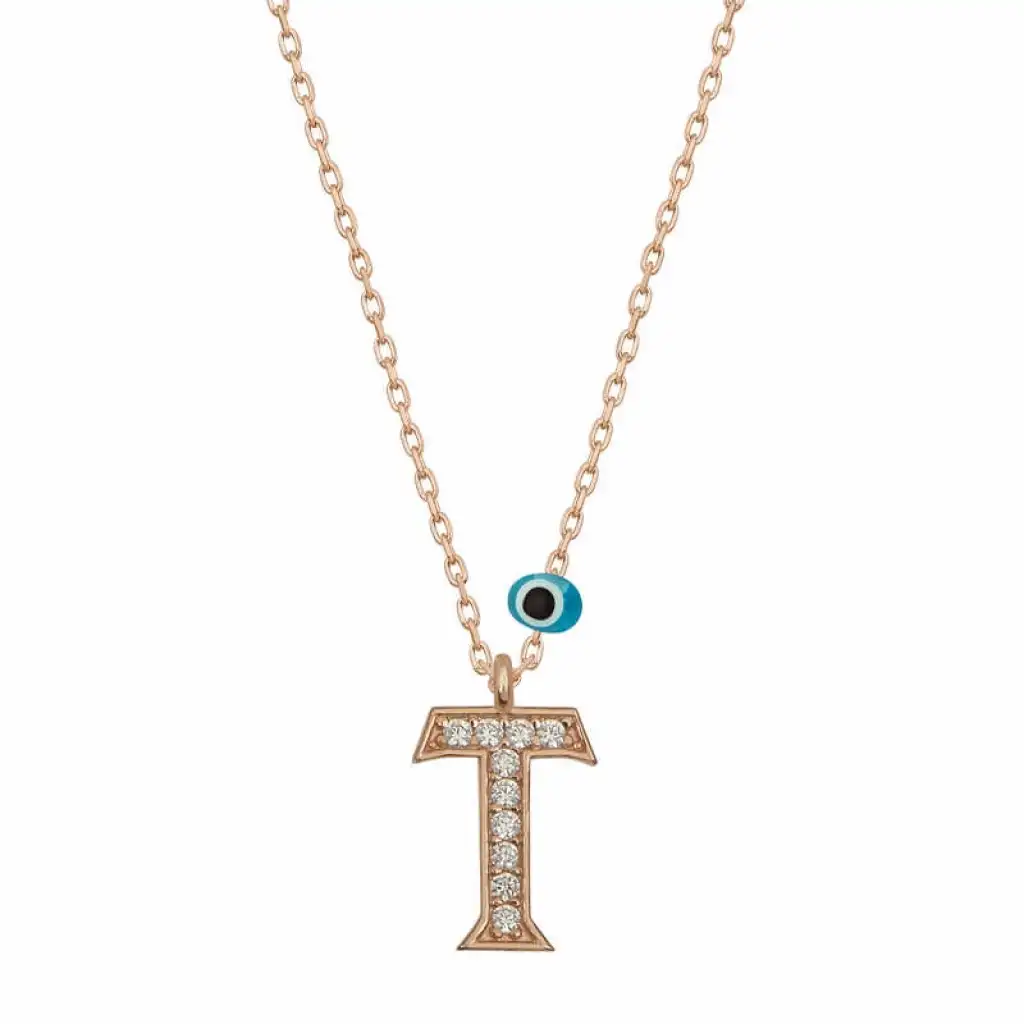 Gümüş Nazar Rose T Harfi Kadın Kolye
