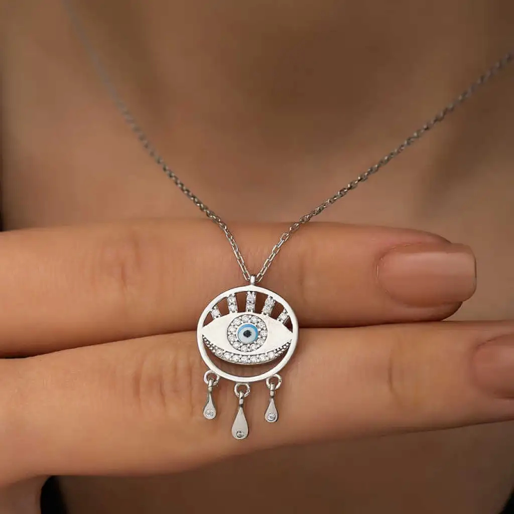 Birçok kültürde kötü enerjinin zararlarından korunmak için çeşitli tılsımlar kullanılmıştır. Doğu kültürlerinin çoğunda kullanılan tılsım ise gözdür. Nazar boncuğu da göz şeklinden ilham alınarak tasarlanmıştır. Mavi rengin seçilmesi de tesadüf değildir. Renkli gözlü kişilerin enerjisini daha etkili yansıttığı inancı gereği nazar boncukları çoğunlukla mavi olarak tasarlanır. Güzelliğiyle göz kamaştıran, nazardan korunmasını istediğiniz kişilere ve sevdiklerinize gümüş nazarlı göz kolyeyi armağan edebilirsiniz. Ürünlerimizin tamamı el emeği ile üretilmiştir. Gümüş ve değerli taşlar nedeniyle ürün ağırlığında ± %10 sapma olabilmektedir.