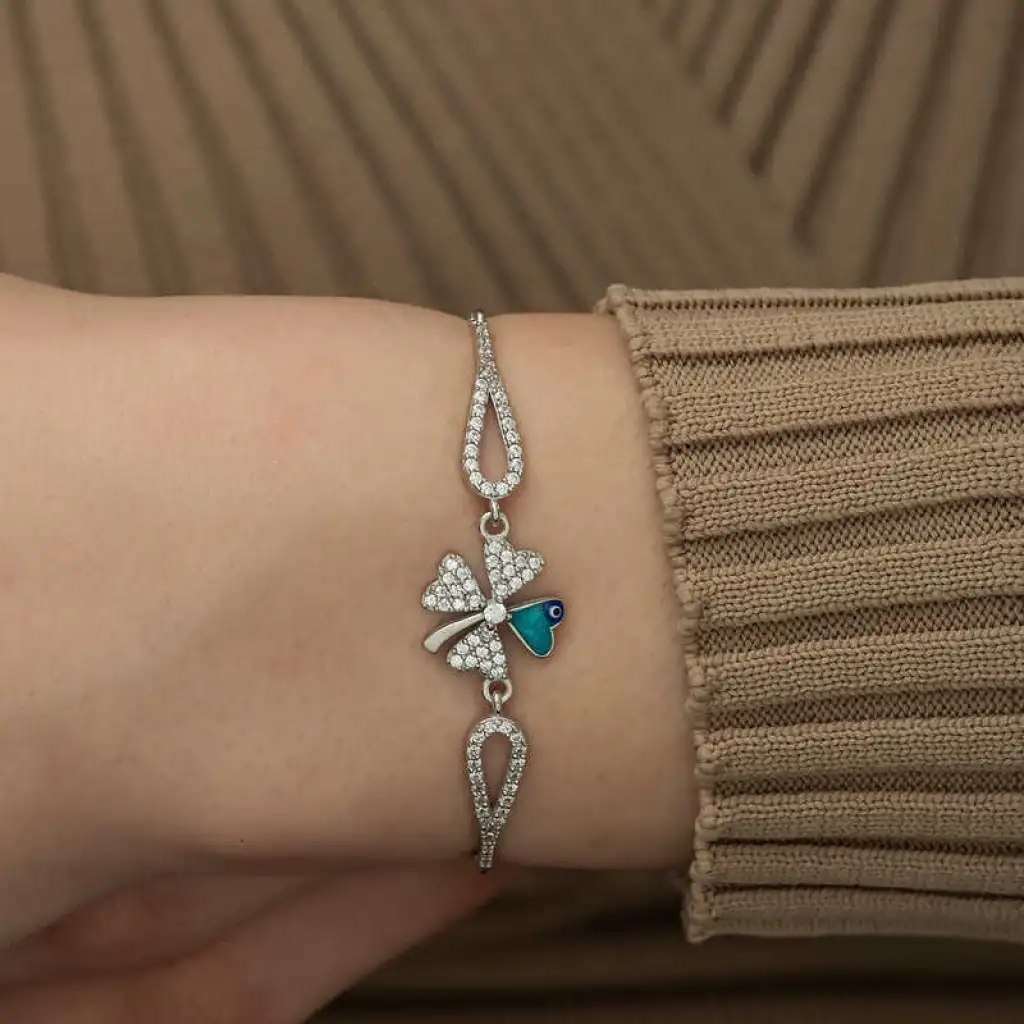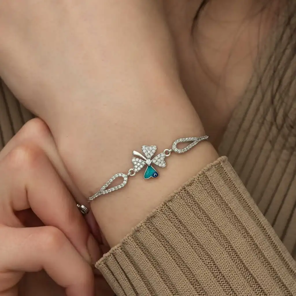 Dört yapraklı yonca bütün kültürlerde iyi şansın sembolü olarak kabul edilir. Yoncanın dört yaprağının da ayrı birer anlamı vardır. Birinci yaprak ümidi, ikincisi imanı, üçüncüsü aşkı, dördüncü yaprak ise şansı simgeler. Dört kalbin birleşmesiyle oluşan özel tasarım bayan bileklik modeli 925 ayar gümüşten imal edilmiştir. Bu zarif bileklik genç aşıkların özel günlerde tercih edebileceği çok şık bir seçenek olacaktır. Gümüş yonca bayan bileklik üzerinde rondyum kaplama vardır. Rodyum kaplama yapılan gümüş bayan bileklikler parlaklığını uzun süre muhafaza eder ve oksitlenmesini geciktirir. Gümüş nazarlı yonca bayan bileklik sizin olduğu kadar sevdiklerinizin de keyifle takacağı en güzel hediyelerden biri olacaktır. Tüm gümüş bayan bileklik modellerimizde olduğu gibi gümüş nazarlı yonca bileklik de el emeği ile üretilmiştir. Gümüş ve değerli taşlar nedeniyle belirtilen ürün ağırlığında ± %10 sapma olabilmektedir.