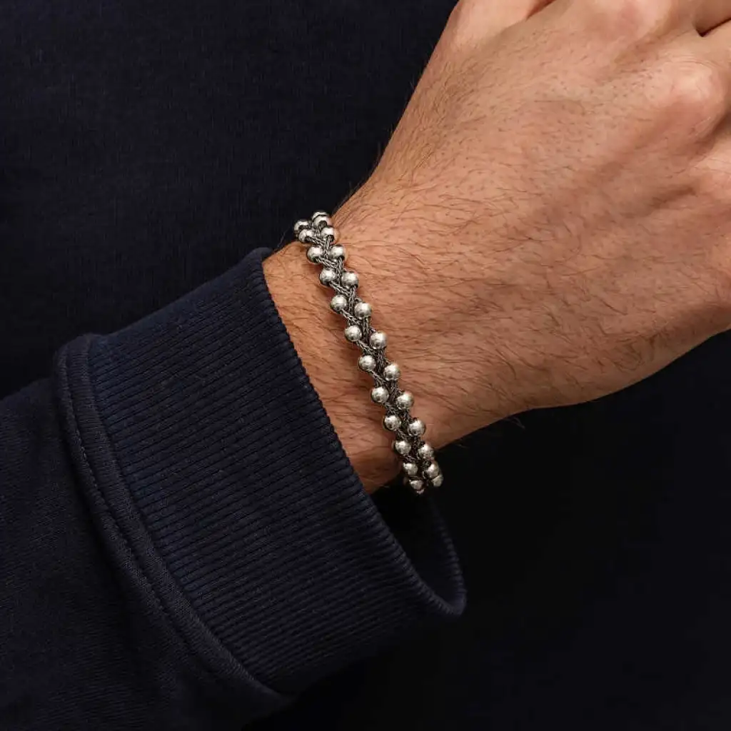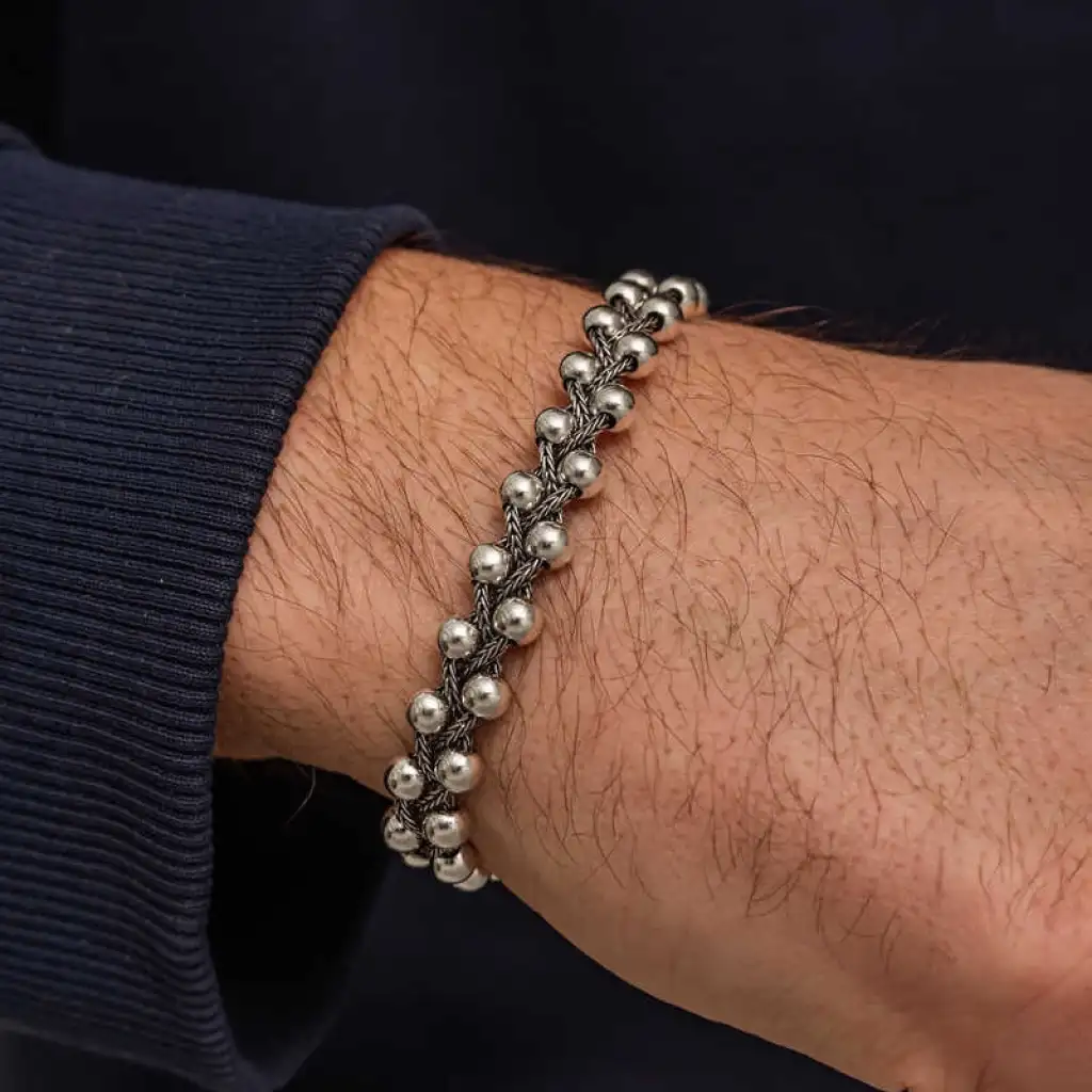 Gümüş, klasik ve zamansız bir metaldir. Bu özelliği ile oksitli toplu bileklik, hem günlük hem de özel günlerde tercih edilen bir aksesuar haline gelir.Oksitli işlem, bilekliği benzersiz kılar. Her aksesuarın farklı bir dokusu ve deseni olduğu için, kullanıcı kendi stilini ifade etme imkanı bulur.Gümüş erkek bileklik; doğum günü hediyesi, sevgililer günü hediyesi veya babalara hediye olarak özel günlerde tercih edilebilecek mükemmel bir seçenektir.Gümüş üzerine oksit kaplama yapılmıştır. Oksit kaplama yapılan gümüş bileklikler parlaklığını uzun süre muhafaza eder. Tüm gümüş bilekliklerde olduğu gibi gümüş toplu erkek bileklik de el emeği ile üretilmiştir. Gümüş ve değerli taşlar nedeniyle belirtilen ortalama ürün ağırlığında ± %10 sapma olabilmektedir.