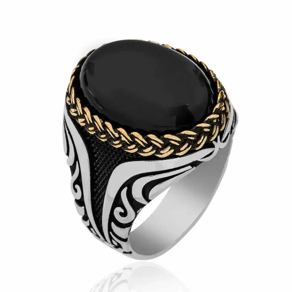 Milyonlarca yıl içerisinde yeryüzüne ulaşan oniks taşı, kayaçların ve bazı bileşenlerin ısınma ve soğumasıyla zaman içerisinde bir araya gelmesi üzerinden oluşmuş bir taştır. Oniks taşı şans taşı olarak bilinmekte olup yarı değerli bir taş türüdür. Oniks, işlenebilir olması ve estetik olarak şık durması sebebiyle eski çağlardan günümüze dek çeşitli süs eşyaları ve takıların yapımında kullanılmıştır. Oniks taşı toprak grubu burçları olan Boğa, Başak ve Oğlak’ın kutsal taşıdır. Bu burca sahip kişiler oniks taşlı aksesuarları tercih ederek negatif enerjiden korunabilirler. Bu şık yüzüğü; kendinize ya da sevdiklerinize doğum gününde, babalar gününde ve diğer özel günlerde hediye edebilirsiniz. Bu şık yüzük 925 ayar gümüşten imal edilmiştir. Gümüş üzerine oksit kaplama yapılmıştır. Oksit kaplama yapılan yüzükler otantik bir görünüme kavuşur. Tüm erkek yüzüklerde olduğu gibi gümüş oniks taşlı desenli erkek yüzük modeli de el emeği ile üretilmiştir. Gümüş ve değerli taşlar nedeniyle belirtilen ortalama ürün ağırlığında ± %10 sapma olabilmektedir.
