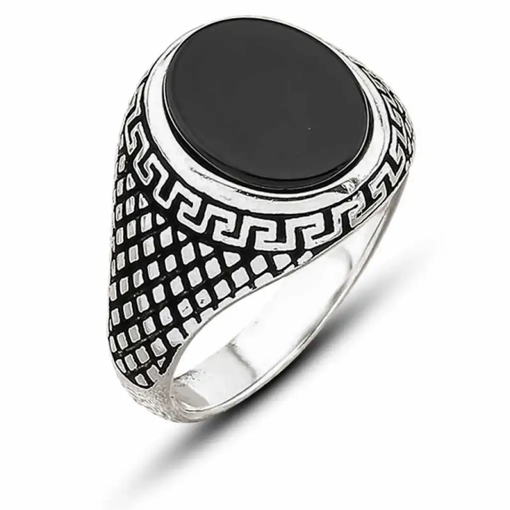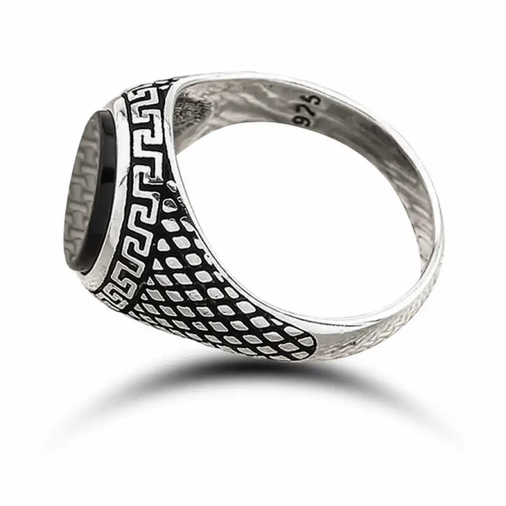 Gümüş Oniks Taşlı Desenli Erkek Yüzük