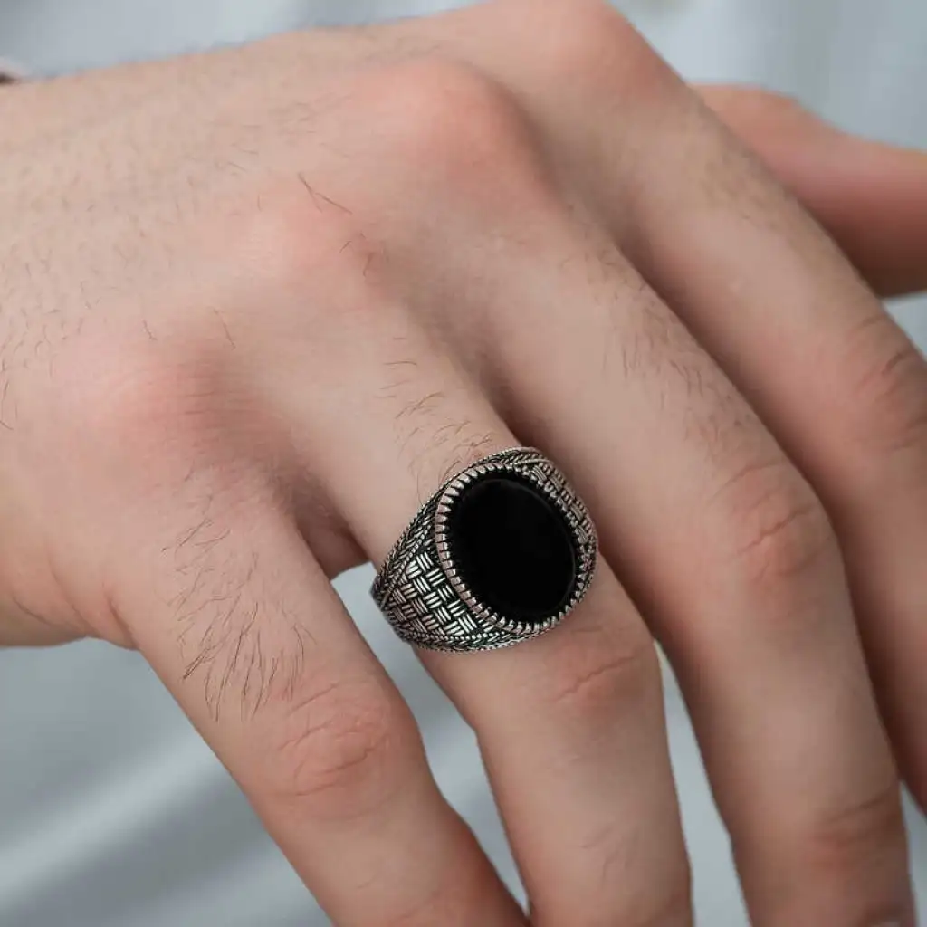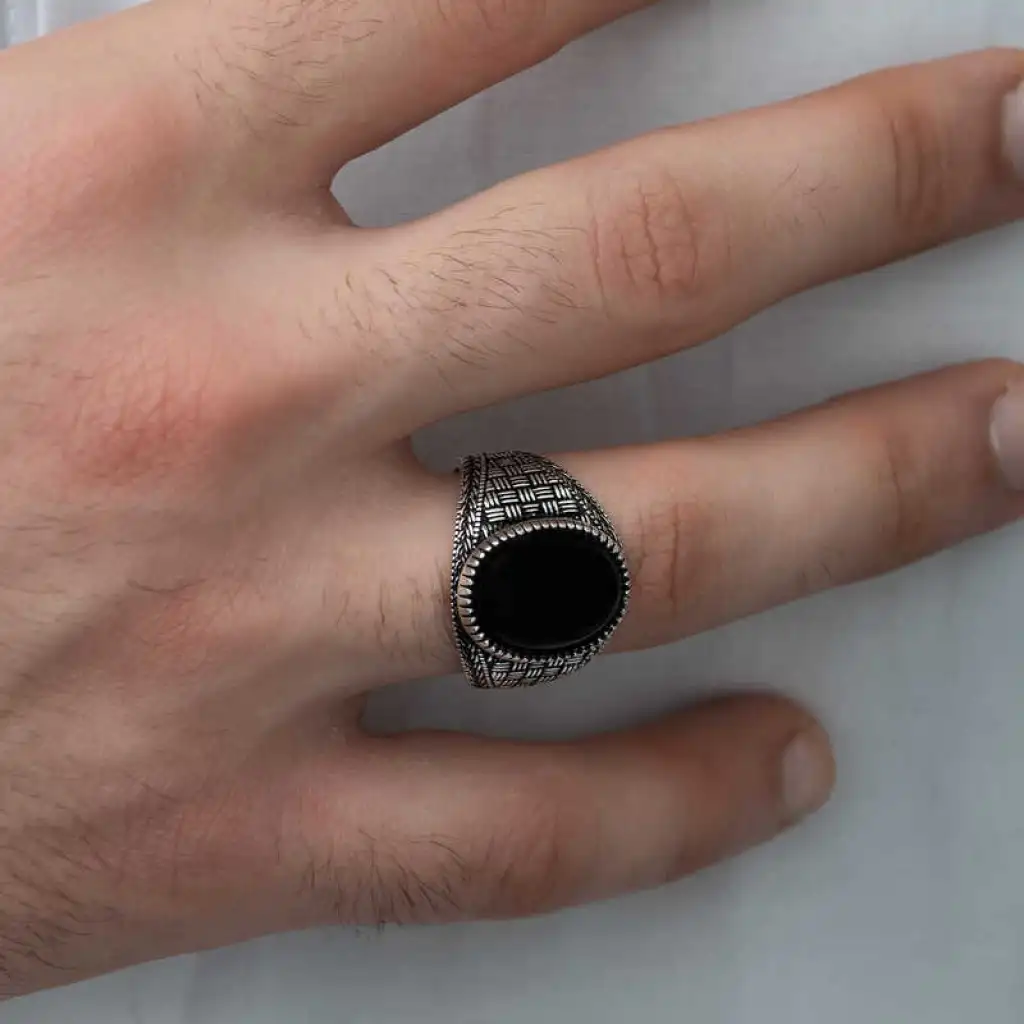 Milyonlarca yıl içerisinde yeryüzüne ulaşan oniks taşı, kayaçların ve bazı bileşenlerin ısınma ve soğumasıyla zaman içerisinde bir araya gelmesi üzerinden oluşmuş bir taştır. Oniks taşı şans taşı olarak bilinmekte olup yarı değerli bir taş türüdür. Oniks, işlenebilir olması ve estetik olarak şık durması sebebiyle eski çağlardan günümüze dek çeşitli süs eşyaları ve takıların yapımında kullanılmıştır. Oniks taşı toprak grubu burçları olan Boğa, Başak ve Oğlak’ın kutsal taşıdır. Bu burca sahip kişiler oniks taşlı aksesuarları tercih ederek negatif enerjiden korunabilirler. Bu şık yüzüğü; kendinize yada sevdiklerinize doğum gününde, babalar gününde ya da özel günlerde tercih edebilirsiniz. Bu şık yüzük 925 ayar gümüşten imal edilmiştir. Gümüş üzerine oksit kaplama yapılmıştır. Oksit kaplama yapılan yüzükler otantik bir görünüme kavuşur. Tüm erkek yüzüklerde olduğu gibi gümüş oniks taşlı örgü desenli erkek yüzük modeli de el emeği ile üretilmiştir. Gümüş ve değerli taşlar nedeniyle belirtilen ortalama ürün ağırlığında ± %10 sapma olabilmektedir.