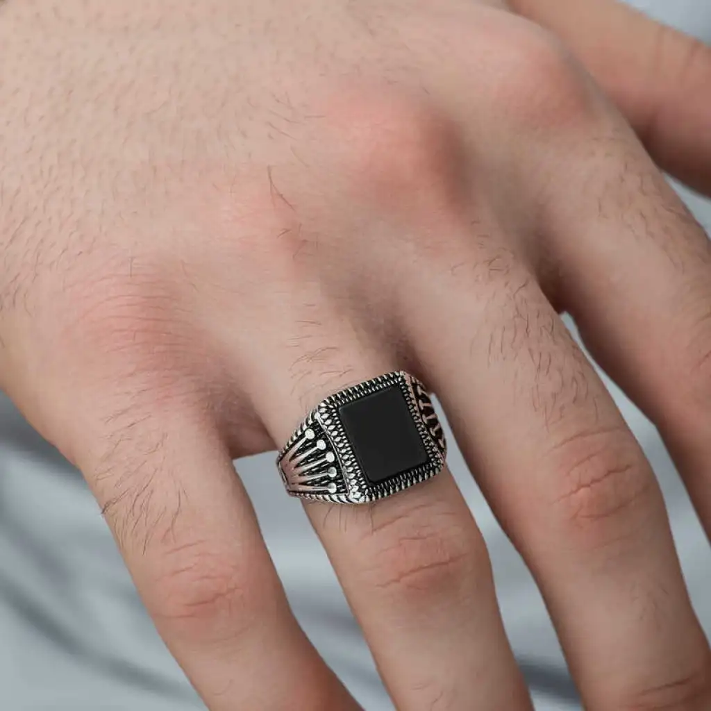Milyonlarca yıl içerisinde yeryüzüne ulaşan oniks taşı, kayaçların ve bazı bileşenlerin ısınma ve soğumasıyla zaman içerisinde bir araya gelmesi üzerinden oluşmuş bir taştır. Oniks taşı şans taşı olarak bilinmekte olup yarı değerli bir taş türüdür. Oniks, işlenebilir olması ve estetik olarak şık durması sebebiyle eski çağlardan günümüze dek çeşitli süs eşyaları ve takıların yapımında kullanılmıştır. Oniks taşı toprak grubu burçları olan Boğa, Başak ve Oğlak’ın kutsal taşıdır. Bu burca sahip kişiler oniks taşlı aksesuarları tercih ederek negatif enerjiden korunabilirler. Yüzüğün yanlarında bulunan parmak şeklindeki taç işareti, ustanın hünerli parmaklarını sembolize etmektedir. Bir diğer yandan kral tacı görüntüsü ile de güç, iktidar ya da soyluluk simgesi olarak nitelendirilmektedir. Bu şık yüzüğü; kendinize ya da sevdiklerinize doğum gününde, babalar gününde ve diğer özel günlerde hediye edebilirsiniz. Bu şık yüzük 925 ayar gümüşten imal edilmiştir. Gümüş üzerine oksit kaplama yapılmıştır. Oksit kaplama yapılan yüzükler otantik bir görünüme kavuşur. Tüm erkek yüzüklerde olduğu gibi gümüş oniks taşlı örgü desenli erkek yüzük modeli de el emeği ile üretilmiştir. Gümüş ve değerli taşlar nedeniyle belirtilen ortalama ürün ağırlığında ± %10 sapma olabilmektedir.