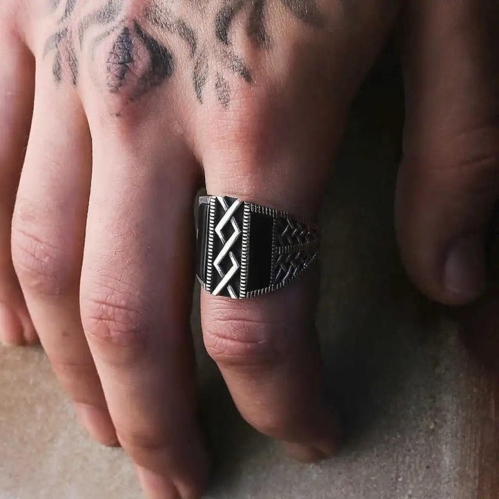 Milyonlarca yıl içerisinde yeryüzüne ulaşan oniks taşı, kayaçların ve bazı bileşenlerin ısınma ve soğumasıyla zaman içerisinde bir araya gelmesi üzerinden oluşmuş bir taştır. Oniks taşı şans taşı olarak bilinmekte olup yarı değerli bir taş türüdür. Oniks, işlenebilir olması ve estetik olarak şık durması sebebiyle eski çağlardan günümüze dek çeşitli süs eşyaları ve takıların yapımında kullanılmıştır. Oniks taşı toprak grubu burçları olan Boğa, Başak ve Oğlak’ın kutsal taşıdır. Bu burca sahip kişiler oniks taşlı aksesuarları tercih ederek negatif enerjiden korunabilirler. Bu şık yüzüğü; kendinize ya da sevdiklerinize doğum gününde, babalar gününde ve diğer özel günlerde hediye edebilirsiniz. Bu şık yüzük 925 ayar gümüşten imal edilmiştir. Gümüş üzerine oksit kaplama yapılmıştır. Oksit kaplama yapılan yüzükler otantik bir görünüme kavuşur. Tüm erkek yüzüklerde olduğu gibi gümüş oniks taşlı desenli erkek yüzük modeli de el emeği ile üretilmiştir. Gümüş ve değerli taşlar nedeniyle belirtilen ortalama ürün ağırlığında ± %10 sapma olabilmektedir.