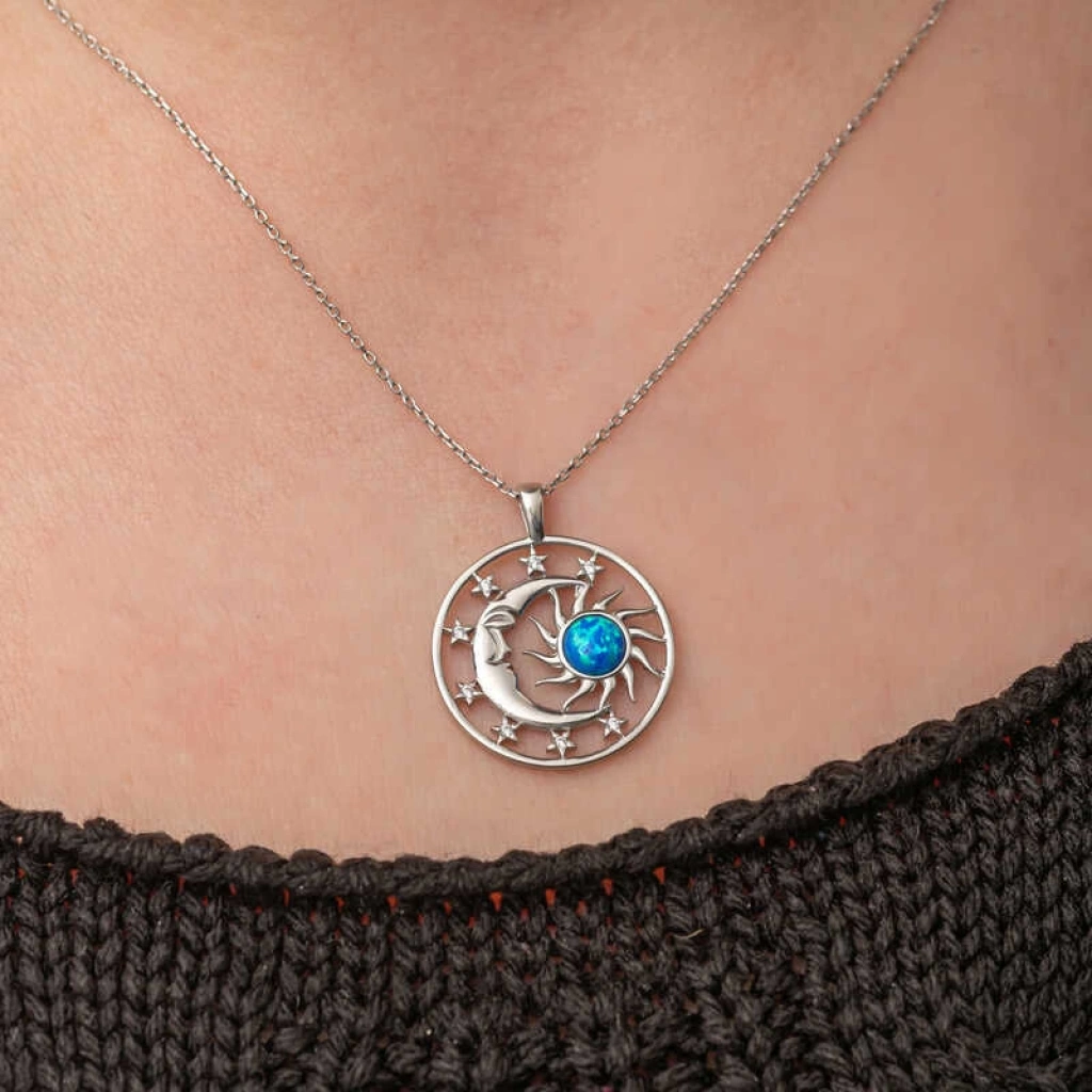 Gümüş Opal Mavi Taşlı Ay Güneş Kadın Kolye
