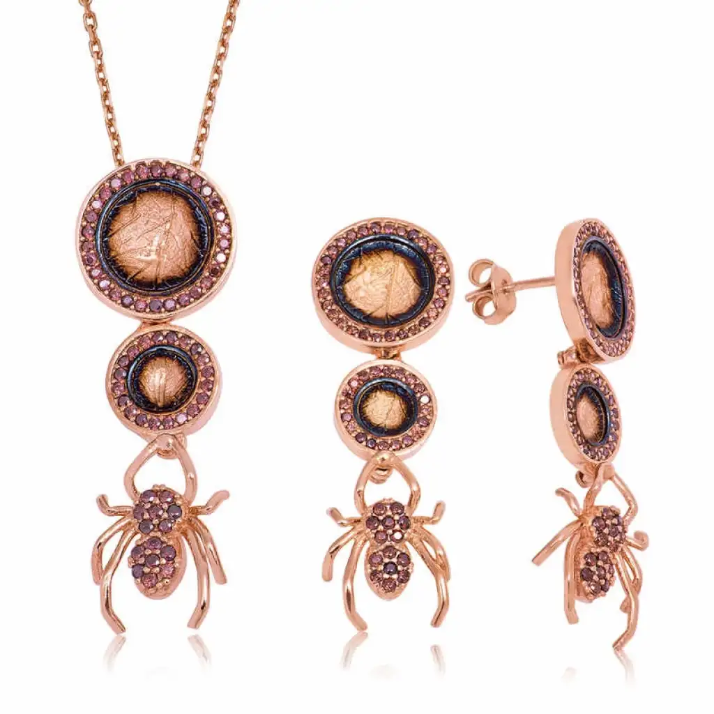 Hz. Muhammed ve Hz. Ebu Bekir hicret ederken Sevr mağarasına saklanmalarını, mağara ağzına gelen bir örümceğin kapıyı ağları ile tamamen örterek kafirlerden koruması müslümanlar açısından bir vefa göstergesidir. Kahverengi zirkon ve rose ışıltısının bir arada olduğu gümüş set sizin olduğu kadar sevdiklerinizin de keyifle takacağı en güzel hediyelerden biri olacaktır. Set 925 ayar gümüşten imal edilmiştir. Gümüş üzerine altın-rose kaplama yapılmıştır. Altın-rose kaplama yapılan ürünler parlaklığını uzun süre muhafaza eder, gümüş rengini pembe renge dönüştürür ve oksitlenmeyi geciktirir. Üzerindeki taşlar zirkondur. Zincir boyu ortalama 45 cm'dir. Ürünlerimizin tamamı el emeği ile üretilmiştir. Gümüş ve değerli taşlar nedeniyle belirtilen ortalama ürün ağırlığında ± %10 sapma olabilmektedir.