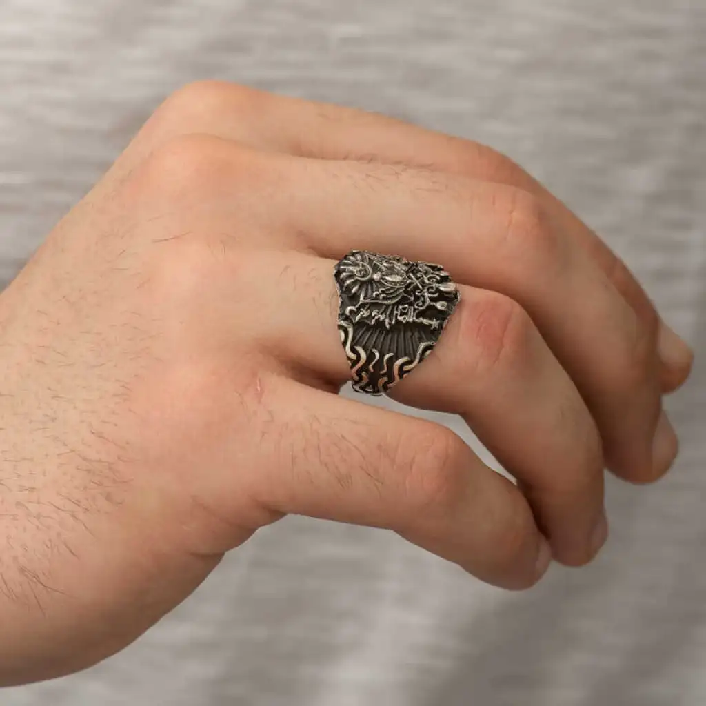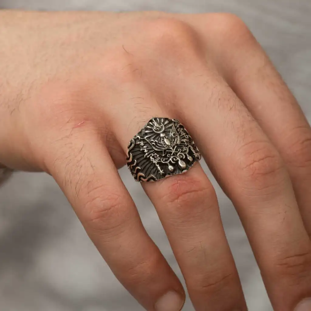 Osmanlı Devlet Arması, 19. yüzyılda Avrupa Birleşik Krallık devlet geleneğindeki nişanlardan esinlenilerek Osmanlı Devleti için hazırlanmıştır. Ondan önce, padişahların tuğraları devlet nişanı yerine geçiyordu. Osmanlı nişanının son hali 1882 yılında Sultan II. Abdülhamit tarafından yürürlüğe konmuştur. Osmanlı Devlet Nişanı'nın içinde iki adet bayrak vardır. Kırmızı zeminde ay-yıldız bulunan bayrak Osmanlıyı, yeşil zemindeki bayrak İslam halifeliğini simgelemektedir. Terazi, Osmanlı adaletini, terazide bulunan kitaplar da adaletin kaynağı olan Osmanlı kanunnamelerini ve Kur'an-ı Kerim'i temsil etmektedir. Osmanlı Devlet Arması'nda saklanan 30 gizem olduğu bilinir. Bu şık erkek yüzük modeli 925 ayar gümüşten imal edilmiştir. Gümüş üzerine eskitme bir görünüm sağlamak için oksit kaplama yapılmıştır. Tüm gümüş erkek yüzük modellerinde olduğu gibi gümüş Osmanlı Devlet Arması erkek yüzük modeli de el emeği ile üretilmiştir. Gümüş ve değerli taşlar nedeniyle belirtilen ortalama ürün ağırlığında ± %10 sapma olabilmektedir.