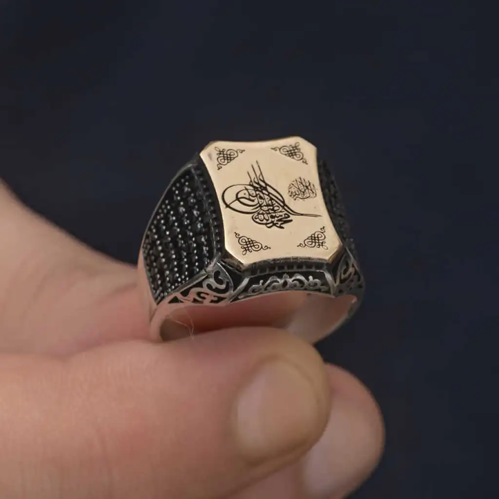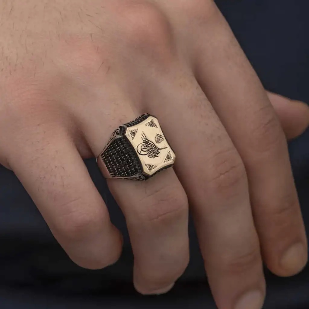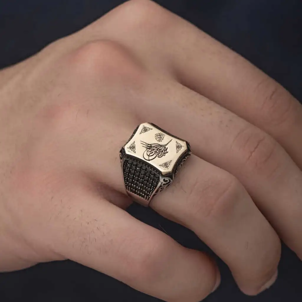 Tuğra, Osmanlı sultanlarının imzası anlamına gelir. Her tuğra; ona ait olan padişahın ismini, varlığını, hükümdarlığını ifade eder. Tuğra sembolü her padişaha göre farklı olmak üzere birçok şekilde günümüze ulaşmıştır. Tuğra; Osmanlının her döneminde korunmuş, önemini hiç kaybetmemiştir. Ve zamanla hat sanatımızda da önemli bir yere sahip olup, günümüzde hattatlar tarafından sanatsal olarak yaşatılmaktadır. Bu sanatı yansıtan gümüş yüzüğü severek kullanabilir ve sevdiklerinize hediye edebilirsiniz. Osmanlı Tuğrası Erkek Yüzük Modeli 925 ayar gümüşten imal edilmiştir. Gümüş üzerine oksit kaplama yapılmıştır. Tüm gümüş erkek yüzüklerinde olduğu gibi gümüş Osmanlı Tuğrası erkek yüzük modeli de tamamen el emeği ile üretilmiştir. Gümüş ve değerli taşlar nedeniyle belirtilen ortalama ürün ağırlığında ± %10 sapma olabilmektedir.