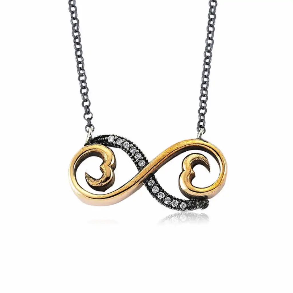 Sevgilinize sonsuz aşkı ifade etmenin en güzel en anlamlı yollarından biri de sonsuzluk kolyesidir. İki kalbin bir araya gelmesiyle sonsuzlaşan aşkınızı isimlendirebileceğiniz bu bayan kolye modeli 925 ayar gümüş ve bronzdan imal edilmiştir. Sevgilinize hediye edeceğiniz bu özel kolye modeli ile ona olan sonsuz aşkınızı sevginizi ifade edebilir sonsuza kadar birlikte olacağınız mesajı verebilirsiniz. Gümüş otantik sonsuzluk bayan kolye modeli üzerine oksit kaplama yapılmıştır. Oksit kaplama yapılan gümüş bayan kolye modelleri parlaklığını uzun süre muhafaza eder ve oksitlenmesi gecikir. Kolye üzerinde bulunan beyaz taşlar zirkondur. Gümüş olan zincir boyu ortalama 45 cm'dir. Gümüş otantik sonsuzluk bayan kolye modeli diğer tüm gümüş sonsuzluk bayan kolye modellerinde olduğu gibi el emeği ile üretilmiştir. Gümüş ve değerli taşlar nedeniyle belirtilen ortalama ürün ağırlığında ± %10 sapma olabilmektedir.
