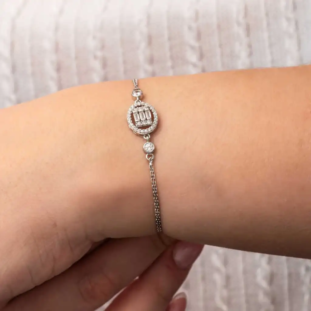 Modaya uyumlu şekilde tasarlanan gümüş baget bileklik modellerini hem gündelik yaşantınızda hem özel gün ve gecelerinizde şık bir şekilde kullanabilirsiniz. Yenilikçi her yaştan kadının beğenisine hitap eden ürünlerle kombinlerinizi tamamlayabilirsiniz. Her biri farklı bir stile hitap edebilen tasarımlarla sizler de spor, klasik ve alternatif giyim tarzlarınıza uygun modellerimizi tercih edebilirsiniz. Bu şık bileklik; doğum günü hediyesi, sevgililer günü hediyesi veya özel günlerde tercih edilebilecek mükemmel bir seçenektir. Gümüş oval baget taşlı kadın bileklik 925 ayar gümüşten imal edilmiştir. Bu bileklik üzerinde rodyum kaplama vardır. Rodyum kaplama yapılan ürünler parlaklığını uzun süre muhafaza eder, oksitlenmesini geciktirir. Tüm gümüş kadın bileklik modellerinde olduğu gibi gümüş baget taşlı kadın bileklik modeli de el emeği ile üretilmiştir. Gümüş ve değerli taşlar nedeniyle belirtilen ortalama ürün ağırlığında ± %10 sapma olabilmektedir.