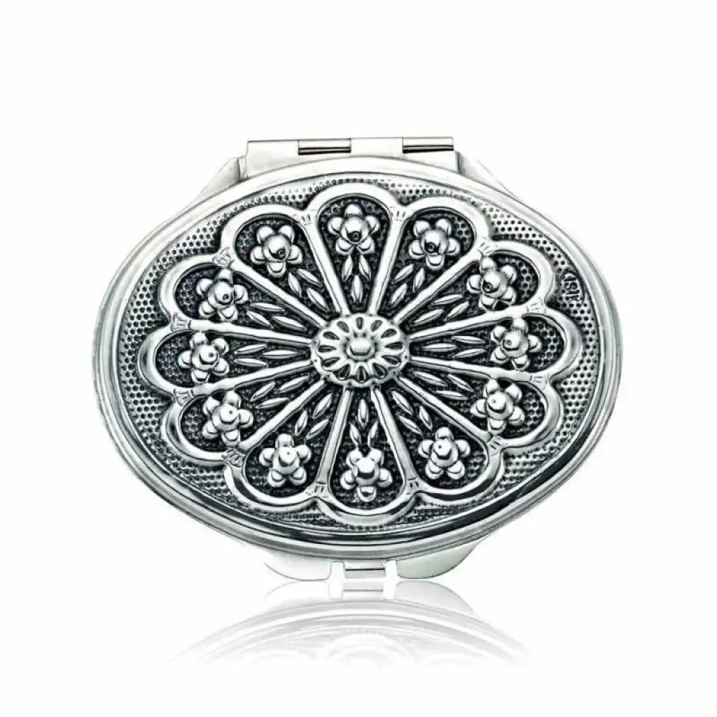 Gümüş Papatya Motifli Kapaklı Oval El Aynası