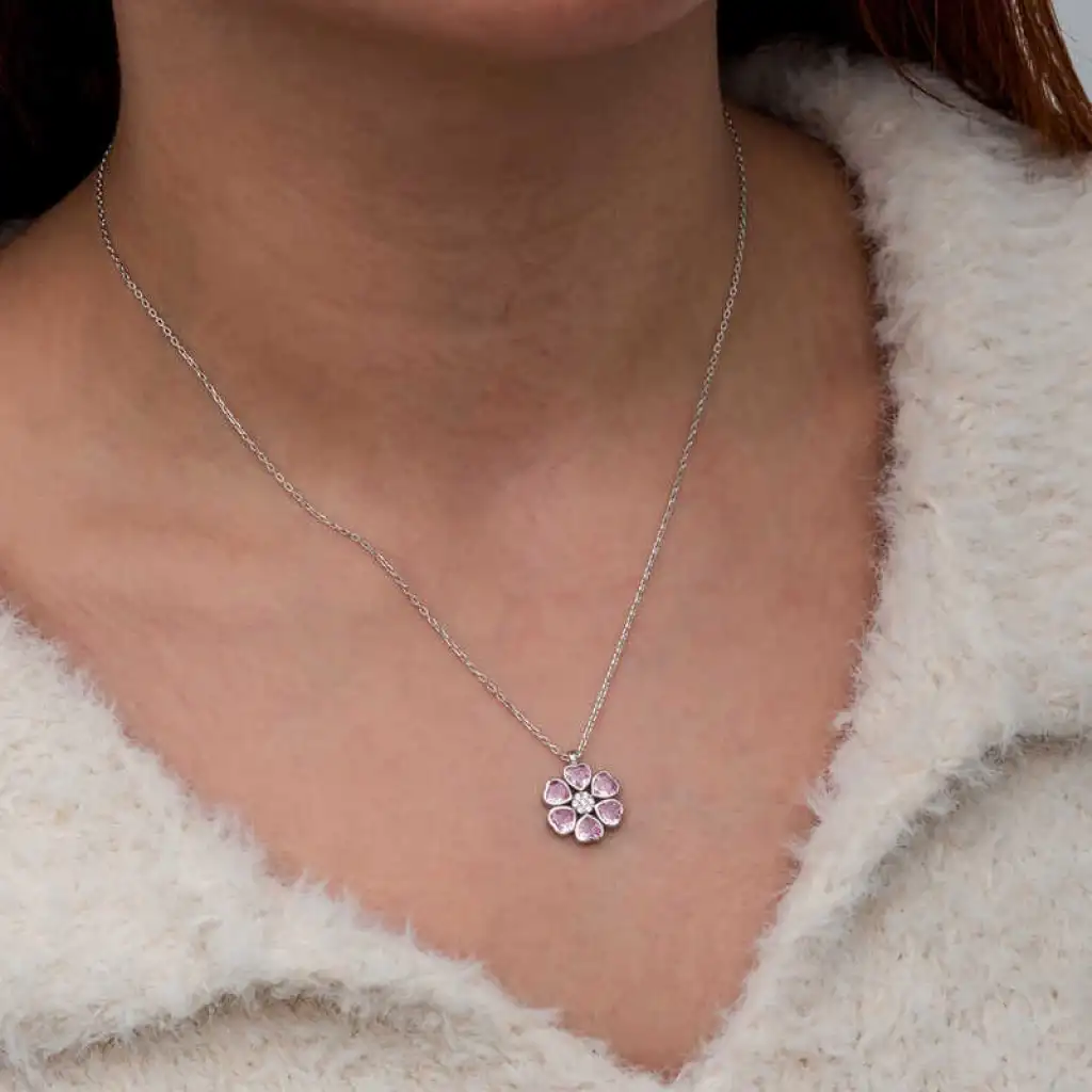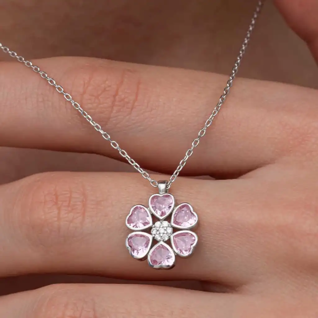 Gümüş Pembe Kalpli Çiçek Kadın Kolye