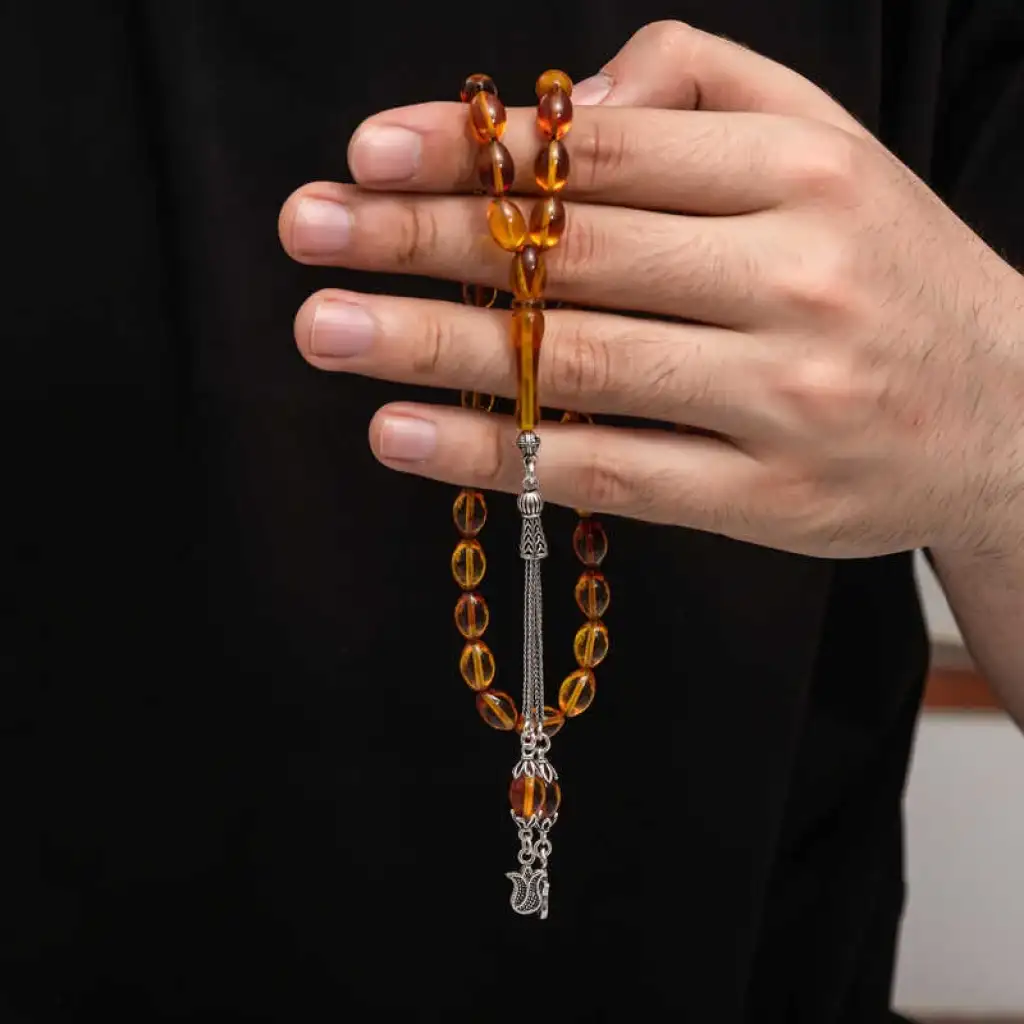 Kehribar, çam ağacı reçinesinin toprak altında uzun yıllar boyunca birikerek oluşan bir maddedir. Hemen hemen taş ile aynı sertliktedir fakat yoğunluğu düşüktür. Çam kokusu yayar. Oluşumu uzun zaman aldığından ve yapay olarak yapılamadığından değerli bir maddedir. Sıkma kehribar ise kehribar taşından farklı olarak onun özelliklerini taşıyan, görüntü itibariyle ona benzeyen fakat gerçek olmayan bir malzemedir. Ülkemizde ve dünyanın bir çok yerinde kehribar taşından çeşitli malzemeler üretilmiştir. Ülkemizde en yaygın olarak tesbih üretilmektedir. Kehribar tesbihler elde ısındıkça kehribar benzeri bir koku verir ve renk değiştirir. Bir çok rengi vardır. Hatta iki rengin birleşiminden oluşan kehribar tesbih modelleri de vardır. Genellikle gümüş püskül ile kullanılır veya sistemli olarak da kullanılabilir. Ülkemizin güzide tesbih ustaları bu malzemeyi sıklıkla işlemek suretiyle çeşitli sanat eserleri meydana getirirler. Bu tesbihler de koleksiyonerler tarafından alınıp satılmaktadır. Gümüş püsküllü sıkma kehribar tesbih modeli de günlük hayatta kullanılabilecek çok şık bir tesbih çeşididir. Özel günlerin vazgeçilmez hediyesi sıkma kehribar tesbihler erkekler için doğum günü, sevgililer günü ve babalar günü gibi özel zamanlarda hediye olarak tercih edilebilir. Gümüş püsküllü sıkma kehribar tesbih modeli diğer kehribar tesbih modellerinde olduğu gibi tamamen el emeği ile imal edilmiştir.