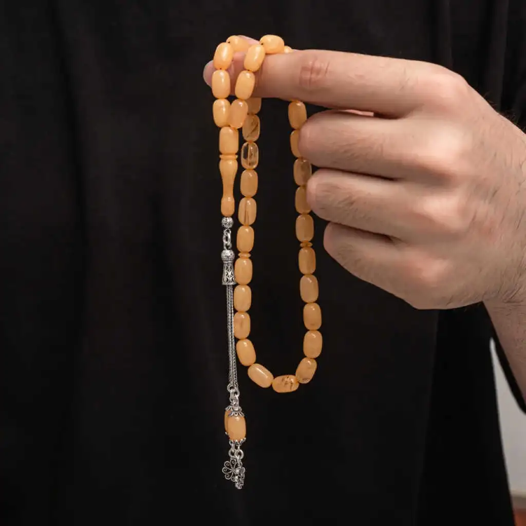 Kehribar, çam ağacı reçinesinin toprak altında uzun yıllar boyunca birikerek oluşan bir maddedir. Hemen hemen taş ile aynı sertliktedir fakat yoğunluğu düşüktür. Çam kokusu yayar. Oluşumu uzun zaman aldığından ve yapay olarak yapılamadığından değerli bir maddedir. Sıkma kehribar ise kehribar taşından farklı olarak onun özelliklerini taşıyan, görüntü itibariyle ona benzeyen fakat gerçek olmayan bir malzemedir. Ülkemizde ve dünyanın bir çok yerinde kehribar taşından çeşitli malzemeler üretilmiştir. Ülkemizde en yaygın olarak tesbih üretilmektedir. Kehribar tesbihler elde ısındıkça kehribar benzeri bir koku verir ve renk değiştirir. Bir çok rengi vardır. Hatta iki rengin birleşiminden oluşan kehribar tesbih modelleri de vardır. Genellikle gümüş püskül ile kullanılır veya sistemli olarak da kullanılabilir. Ülkemizin güzide tesbih ustaları bu malzemeyi sıklıkla işlemek suretiyle çeşitli sanat eserleri meydana getirirler. Bu tesbihler de koleksiyonerler tarafından alınıp satılmaktadır. Gümüş püsküllü sıkma kehribar tesbih modeli de günlük hayatta kullanılabilecek çok şık bir tesbih çeşididir. Özel günlerin vazgeçilmez hediyesi sıkma kehribar tesbihler erkekler için doğum günü, sevgililer günü ve babalar günü gibi özel zamanlarda hediye olarak tercih edilebilir. Gümüş püsküllü sıkma kehribar tesbih modeli diğer kehribar tesbih modellerinde olduğu gibi tamamen el emeği ile imal edilmiştir.