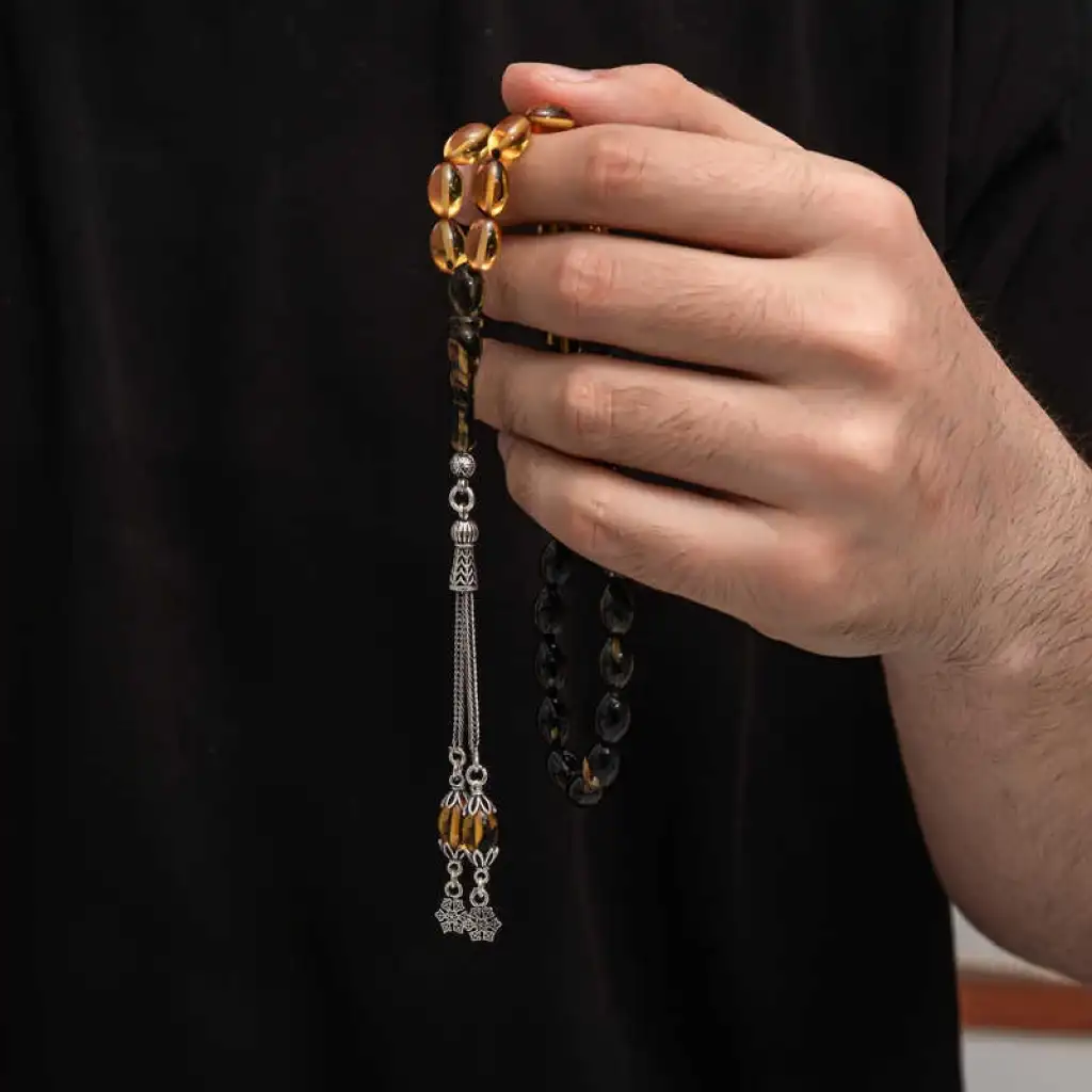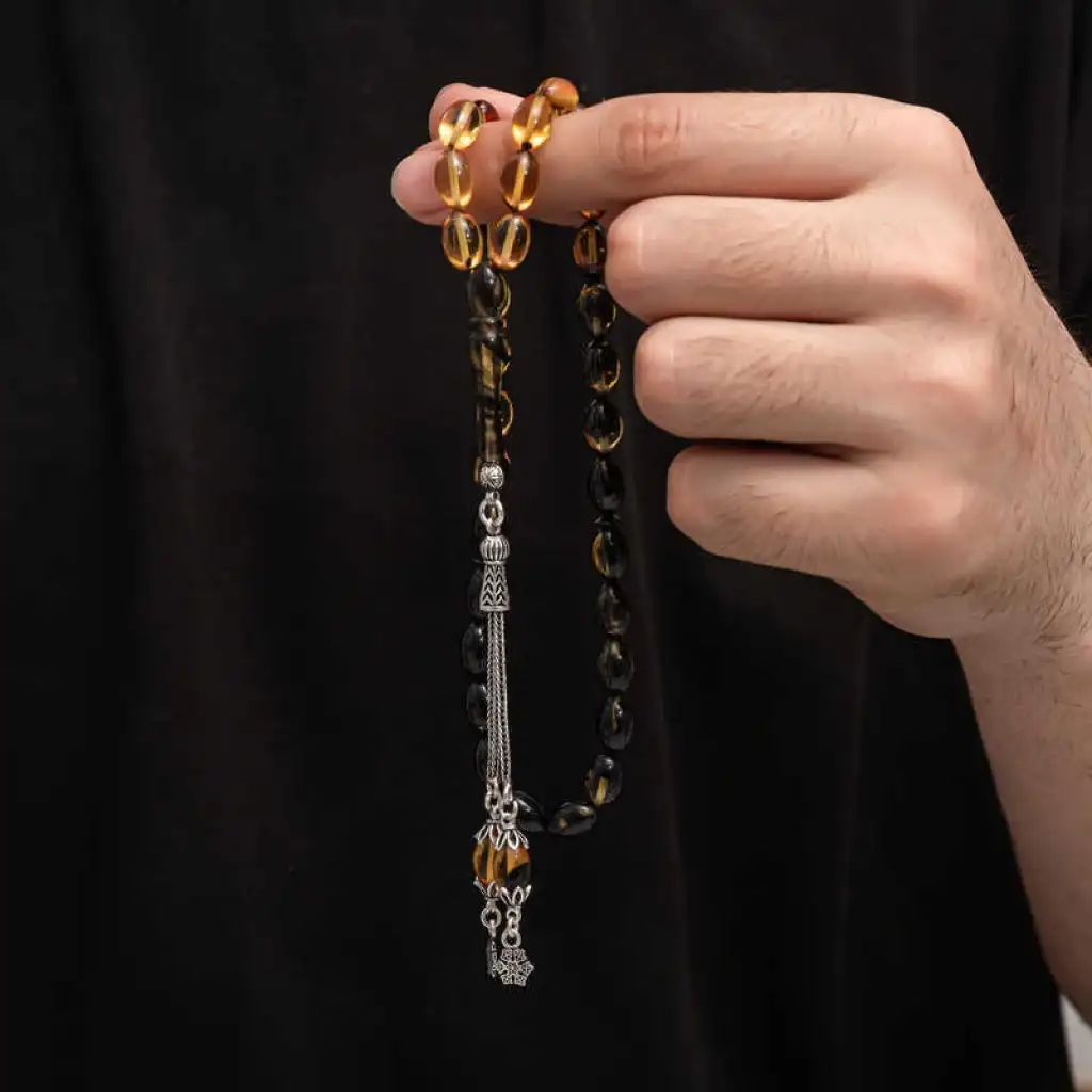 Kehribar, çam ağacı reçinesinin toprak altında uzun yıllar boyunca birikerek oluşan bir maddedir. Hemen hemen taş ile aynı sertliktedir fakat yoğunluğu düşüktür. Çam kokusu yayar. Oluşumu uzun zaman aldığından ve yapay olarak yapılamadığından değerli bir maddedir. Sıkma kehribar ise kehribar taşından farklı olarak onun özelliklerini taşıyan, görüntü itibariyle ona benzeyen fakat gerçek olmayan bir malzemedir. Ülkemizde ve dünyanın bir çok yerinde kehribar taşından çeşitli malzemeler üretilmiştir. Ülkemizde en yaygın olarak tesbih üretilmektedir. Kehribar tesbihler elde ısındıkça kehribar benzeri bir koku verir ve renk değiştirir. Bir çok rengi vardır. Hatta iki rengin birleşiminden oluşan kehribar tesbih modelleri de vardır. Genellikle gümüş püskül ile kullanılır veya sistemli olarak da kullanılabilir. Ülkemizin güzide tesbih ustaları bu malzemeyi sıklıkla işlemek suretiyle çeşitli sanat eserleri meydana getirirler. Bu tesbihler de koleksiyonerler tarafından alınıp satılmaktadır. Gümüş püsküllü sıkma kehribar tesbih modeli de günlük hayatta kullanılabilecek çok şık bir tesbih çeşididir. Özel günlerin vazgeçilmez hediyesi sıkma kehribar tesbihler erkekler için doğum günü, sevgililer günü ve babalar günü gibi özel zamanlarda hediye olarak tercih edilebilir. Gümüş püsküllü sıkma kehribar tesbih modeli diğer kehribar tesbih modellerinde olduğu gibi tamamen el emeği ile imal edilmiştir.