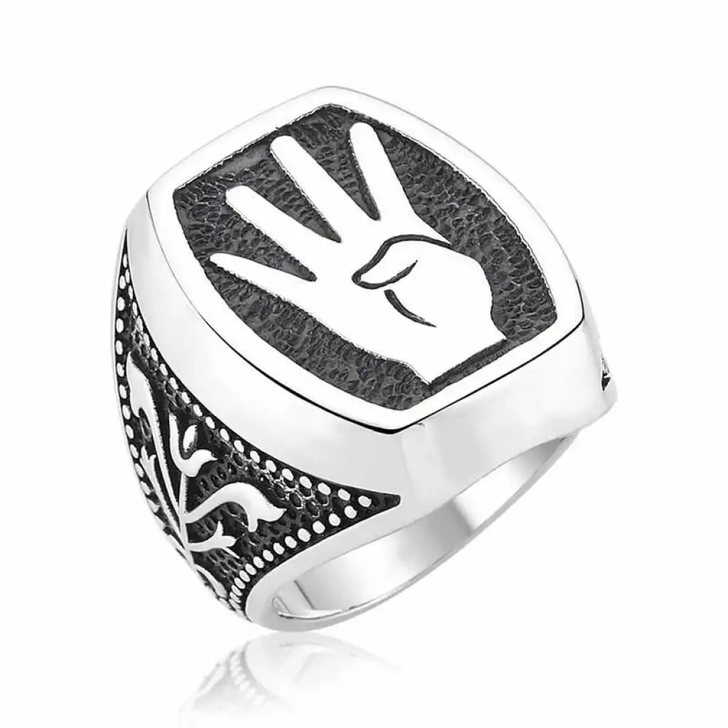 Rabia, Arapça’da 4’üncü demektir. Mursi taraftarları hem toplandıkları Rabiatül Adeviyye Meydanı’na hem de Mursi’nin 4. Cumhurbaşkanı olmasına gönderme yaptıkları için bu işareti benimsemişlerdir. Rabiatül Adeviyye Meydanı ise adını 8. yüzyılda yaşamış sufi bir kadın şairden alıyor. Rabia da ailesinin 4. çocuğudur. Rabia çocukluğunu köle olarak geçirir ve kaçma teşebbüslerinde sonra özgür kalır. Bu yüzden Mısır’da özgürlüğün simgesi olur. Sizde bu anlamlı yüzüğü severek kullanabilir sevdiklerinize armağan edebilirsiniz. Gümüş Rabia İşareti erkek yüzük 925 ayar gümüşten imal edilmiştir. Gümüş üzerine rodyum kaplama yapılmıştır. Rodyum kaplama yapılan ürünler parlaklığını uzun süre muhafaza eder, oksitlenmesi gecikir. Ürünlerimizin tamamı el emeği ile üretilmiştir. Gümüş ve değerli taşlar nedeniyle ürün ağırlığında ± %10 sapma olabilmektedir.