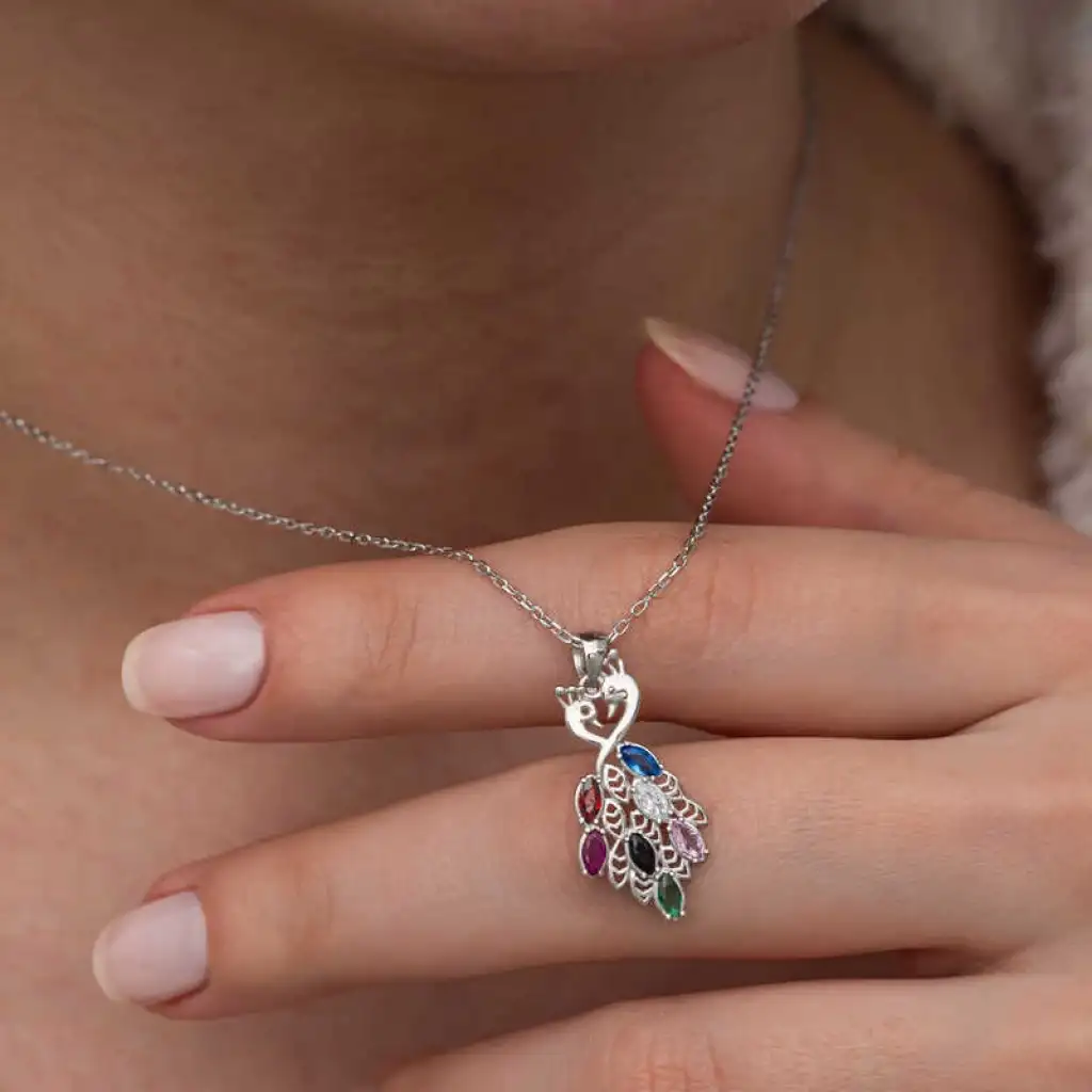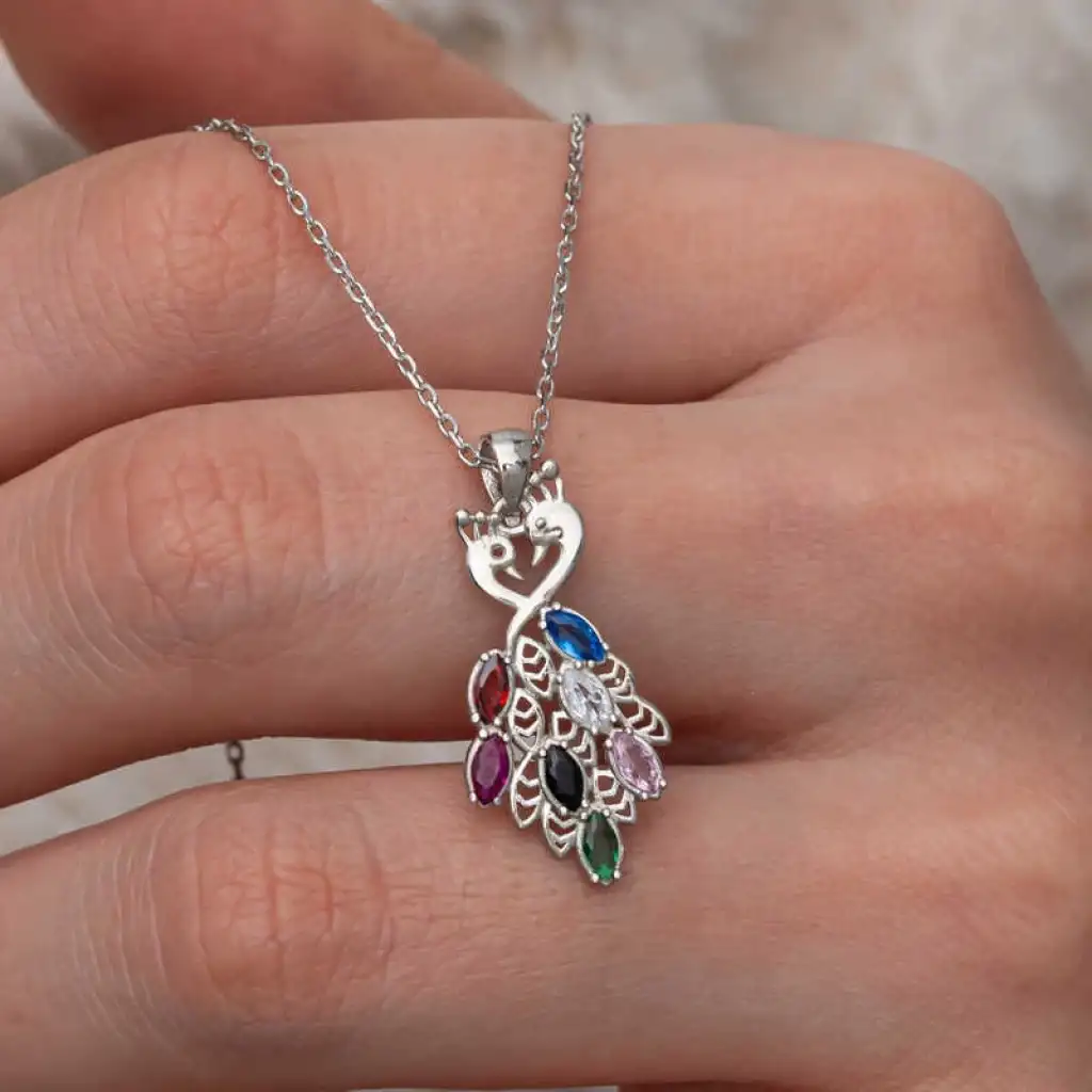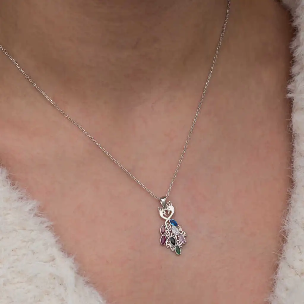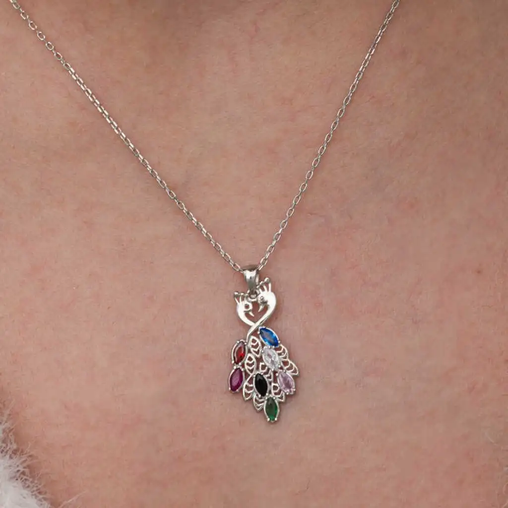 Gümüş Renkli Taşlı Tavus Kuşu Kadın Kolye