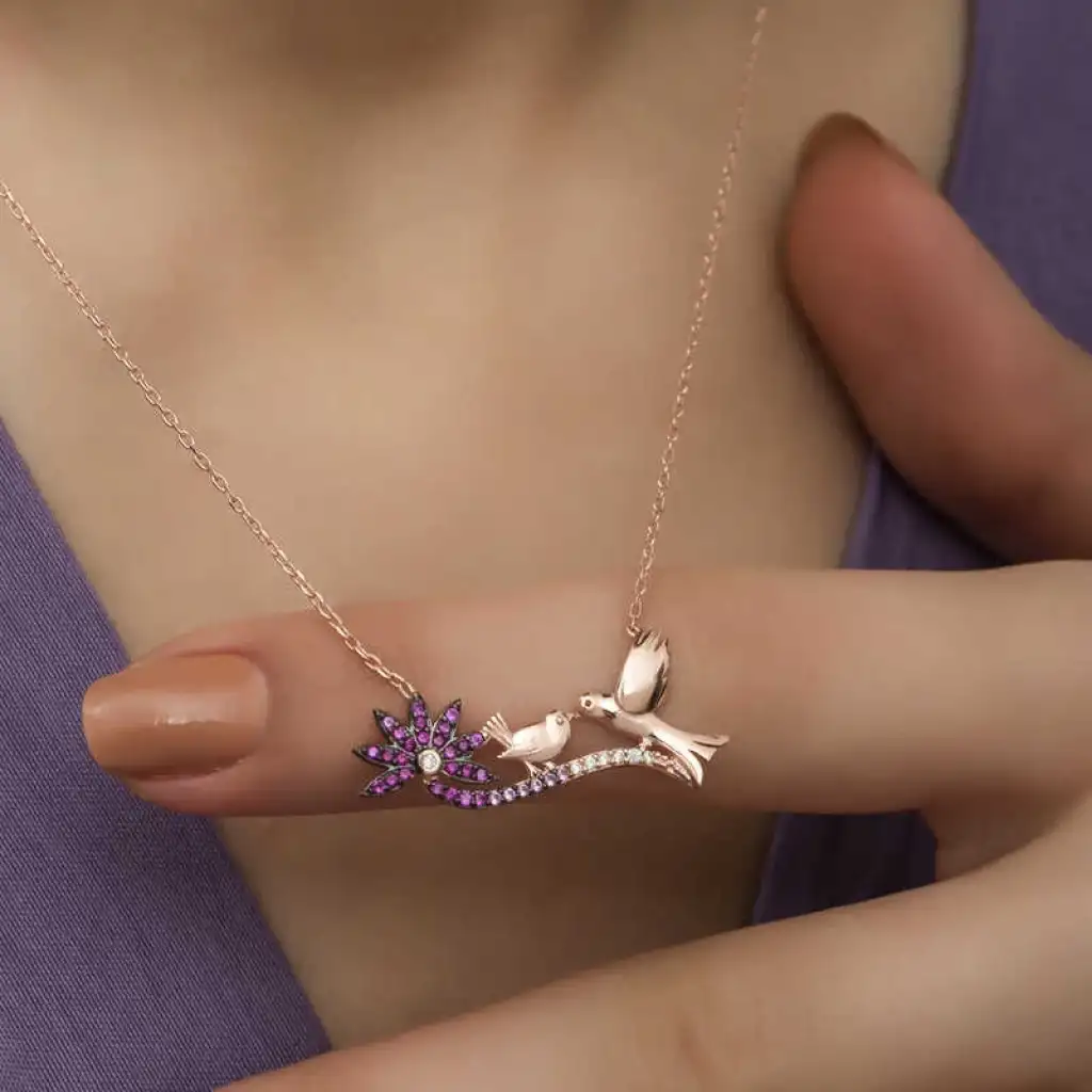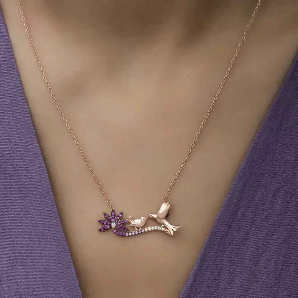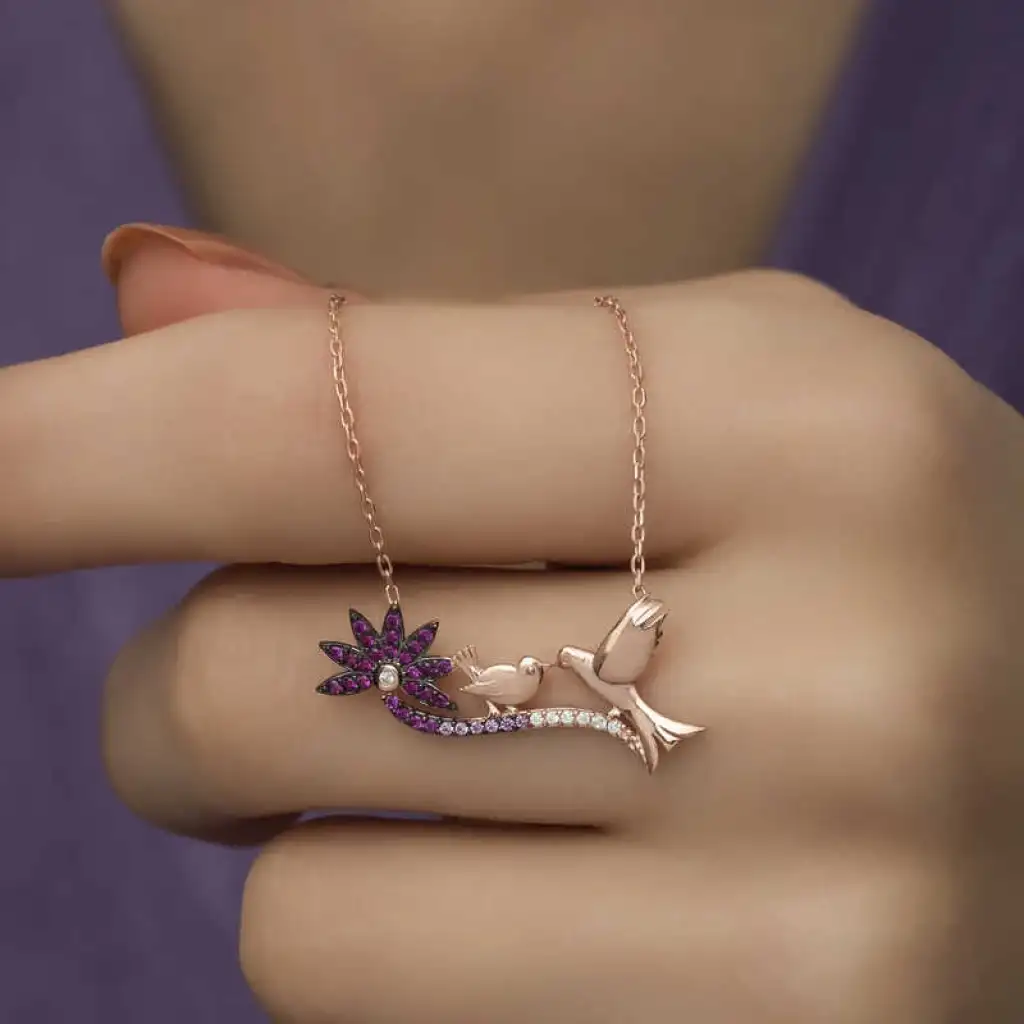 Anne ve çocuk arasındaki sevgiyi temsil eden özel bir tasarımdır. Annenize olan bağlılığınızı belirtmek için alabileceğiniz en uygun hediyelerden biri bu anne ve yavru kuş bayan kolyesi olacaktır. Anneniz için tasarlanan bu özel tasarım anne ve yavru kuş bayan kolyesi 925 ayar gümüşten imal edilmiştir. Gümüş üzerine rose kaplama yapılmıştır. Rose kaplama yapılan gümüş anne ve yavru kuş bayan kolye modelleri parlaklığını uzun süre muhafaza eder ve oksitlenmesi gecikir. Kolye üzerinde bulunan taşlar zirkondur. Gümüş olan zincir boyu ortalama 45 cm'dir. Gümüş anne ve yavru kuş bayan kolye el emeği ile üretilmiştir. Gümüş ve değerli taşlar nedeniyle belirtilen ortalama ürün ağırlığında ± %10 sapma olabilmektedir.