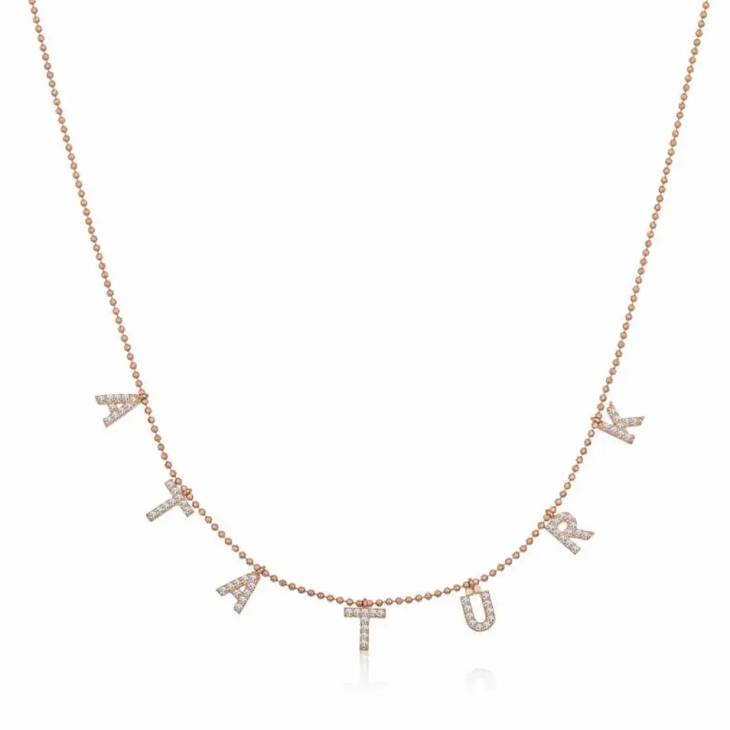 Türkiye Cumhuriyeti'nin kurucusu ve ilk cumhurbaşkanı Mustafa Kemal Atatürk'ün ismi her an yanınızda taşımak ve sevdiklerinizle paylaşmak için kaçırılmayacak bir kolye ile karşı karşıyasınız. Anlam itibariyle sevdiklerinize hediye edebileceğiniz şık hediyelerden biri olacaktır. Bu anlamlı kolye 925 ayar gümüşten imal edilmiştir. Gümüş Atatürk yazılı bayan kolye rose kaplama yapılmıştır. Rose kaplama yapılan gümüş bayan kolye modelleri parlaklığını uzun süre muhafaza eder. Tüm gümüş bayan kolye modellerinde olduğu gibi gümüş Atatürk yazılı bayan kolye modeli de el emeği ile üretilmiştir. Gümüş ve değerli taşlar nedeniyle belirtilen ürün ağırlığında ± %10 sapma olabilmektedir.