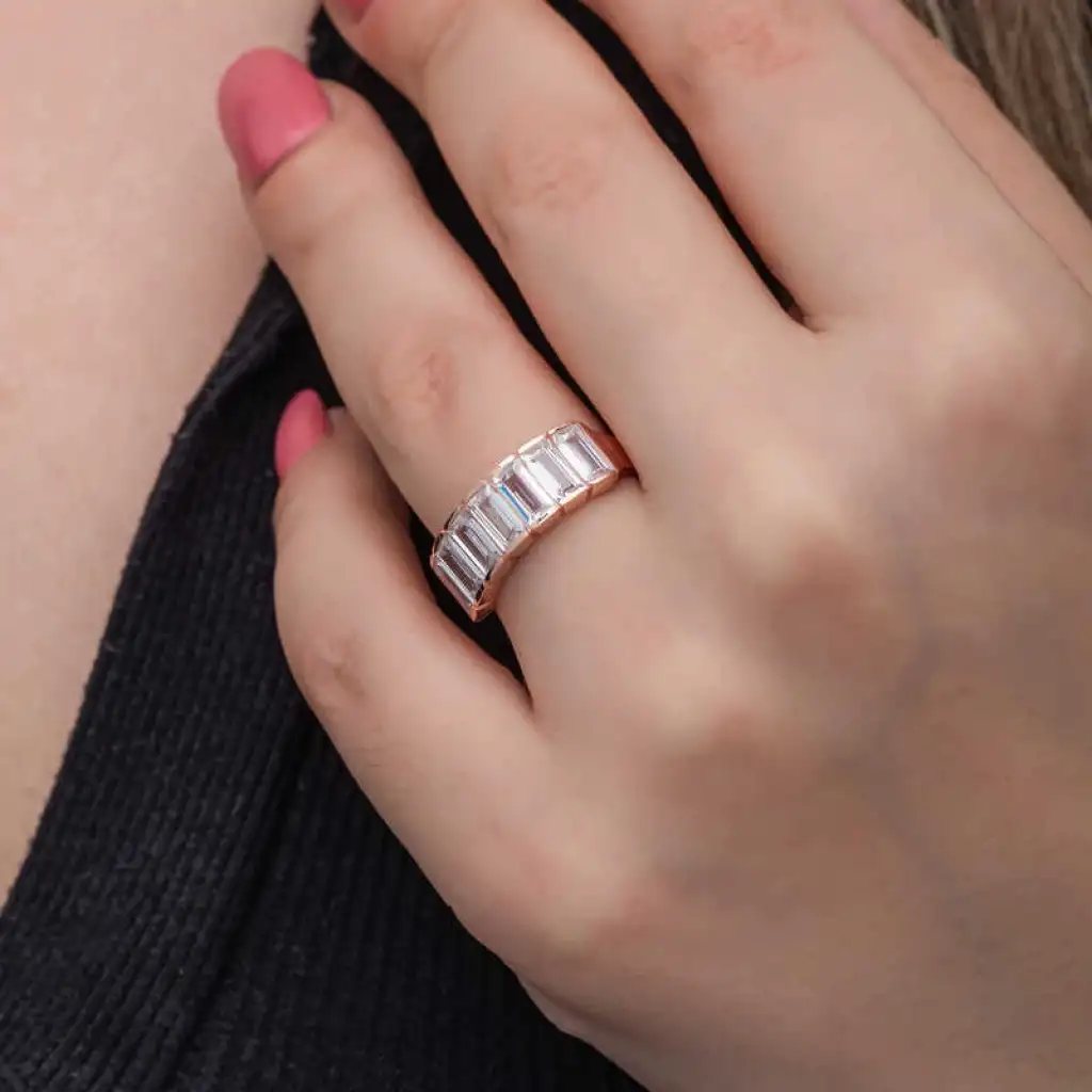 Işıl ışıl baget taşlarla süslenmiş bu şık yüzük modeli; doğum günü hediyesi, sevgililer günü hediyesi veya annelere hediye olarak özel günlerde tercih edebileceğiniz çok şık bir seçenektir. Baget beyaz taşlı kadın yüzük 925 ayar gümüşten imal edilmiştir. Gümüş üzerine rose kaplama yapılmıştır. Rose kaplama yapılan gümüş yüzükler parlaklığını uzun süre muhafaza eder, oksitlenmesi gecikir. Üzerinde bulunan taşlar bagetttir. Tüm kadın gümüş yüzüklerde olduğu gibi gümüş baget beyaz taşlı kadın yüzük modeli de el emeği ile üretilmiştir. Gümüş ve değerli taşlar nedeniyle belirtilen ortalama ürün ağırlığında ± %10 sapma olabilmektedir.