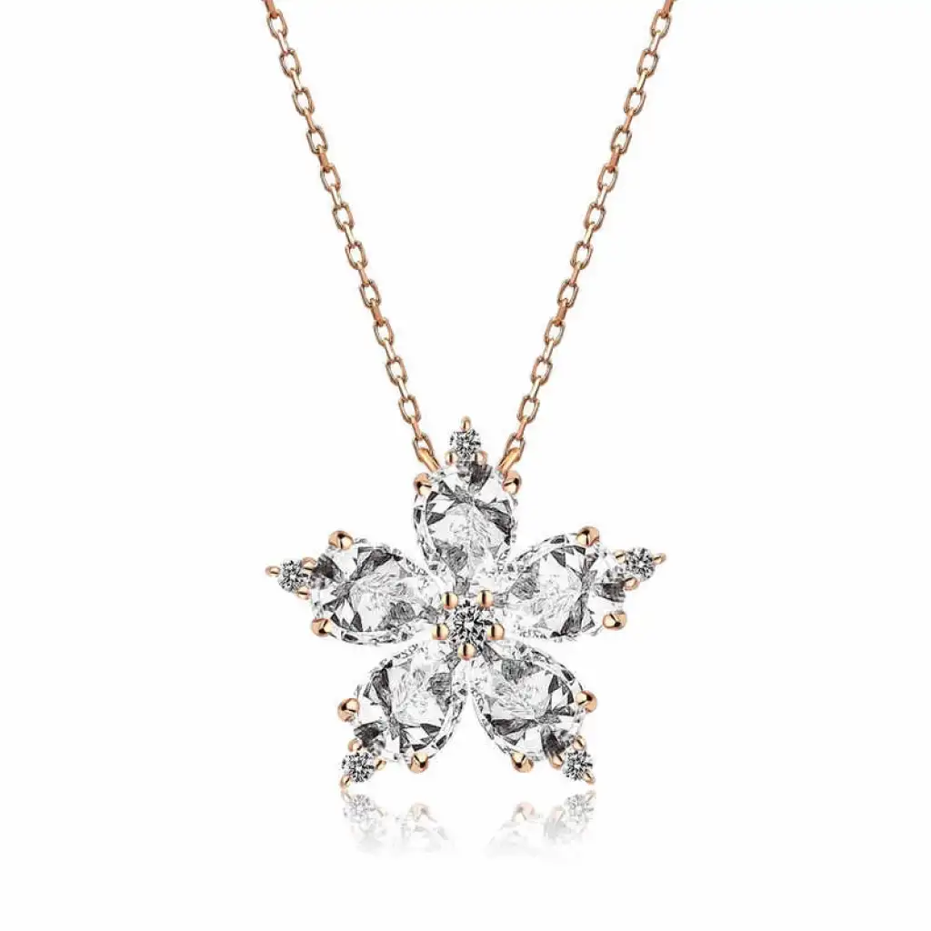 Büyüleyici kamelya çiçeğinden ilham alınarak tasarlanan kolye ışıltısı sizi de sarsın. Işıl ışıl taşlardan oluşan kamelya çiçeği kolye; doğum günü hediyesi, sevgililer günü hediyesi veya özel günlerde tercih edilebilecek mükemmel bir seçenektir. Gümüş beyaz kamelya çiçeği bayan kolye 925 ayar gümüşten imal edilmiştir. Bu kolye üzerinde rose kaplama vardır. Rose kaplama yapılan gümüş bayan kolye modelleri parlaklığını uzun süre muhafaza eder. Tüm gümüş bayan kolye modellerimizde olduğu gibi gümüş beyaz kamelya çiçeği bayan kolye modeli de el emeği ile üretilmiştir. Gümüş ve değerli taşlar nedeniyle belirtilen ortalama ürün ağırlığında ± %10 sapma olabilmektedir.