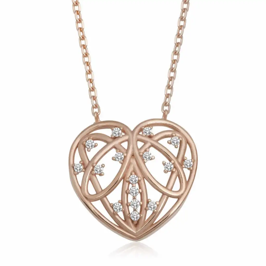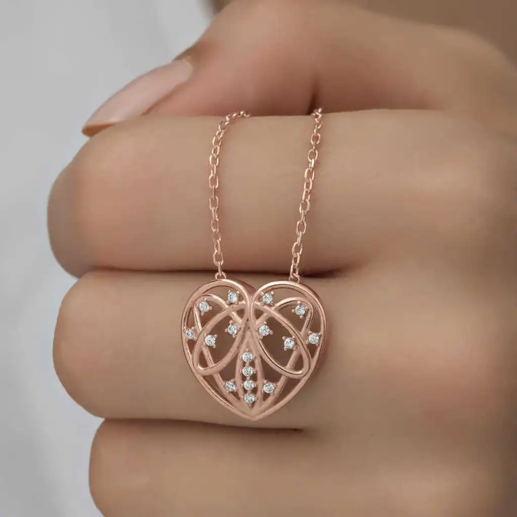 Kalp simgesi daima koşulsuz sevginin ve aşkın sembolü olmuştur. Dini öğretilerde ise kalbin gücü sınırsızdır. Çünkü kalp Yaradanın evi, bizim ise evrene açılan gerçeklik kapımızdır. Bu şık gümüş bombeli kalp kadın kolye; doğum günü hediyesi, sevgililer günü hediyesi veya annelere hediye olarak özel günlerde tercih edilebilecek mükemmel bir seçenektir. Gümüş kalp kadın kolye 925 ayar gümüşten imal edilmiştir. Bu kolye üzerinde rose kaplama yapılmıştır. Rose kaplama yapılan gümüş kadın kolye modelleri parlaklığını uzun süre muhafaza eder. Üzerinde bulunan taşlar zirkondur. Tüm gümüş kadın kolye modellerimizde olduğu gibi gümüş bombeli kalp kadın kolye modeli de el emeği ile üretilmiştir. Gümüş ve değerli taşlar nedeniyle belirtilen ortalama ürün ağırlığında ± %10 sapma olabilmektedir.