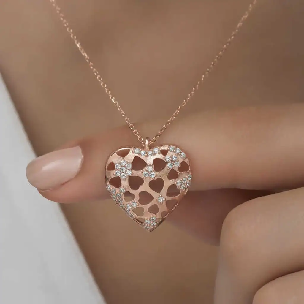 Kalp simgesi daima koşulsuz sevginin ve aşkın sembolü olmuştur. Dini öğretilerde ise kalbin gücü sınırsızdır. Çünkü kalp Yaradanın evi, bizim ise evrene açılan gerçeklik kapımızdır. Bu şık gümüş bombeli kalp kadın kolye; doğum günü hediyesi, sevgililer günü hediyesi veya annelere hediye olarak özel günlerde tercih edilebilecek mükemmel bir seçenektir. Gümüş kalp kadın kolye 925 ayar gümüşten imal edilmiştir. Bu kolye üzerinde rose kaplama yapılmıştır. Rose kaplama yapılan gümüş kadın kolye modelleri parlaklığını uzun süre muhafaza eder. Üzerinde bulunan taşlar zirkondur. Tüm gümüş kadın kolye modellerimizde olduğu gibi gümüş bombeli kalp kadın kolye modeli de el emeği ile üretilmiştir. Gümüş ve değerli taşlar nedeniyle belirtilen ortalama ürün ağırlığında ± %10 sapma olabilmektedir.