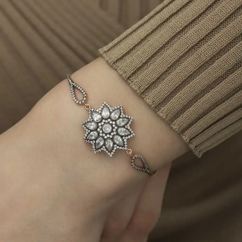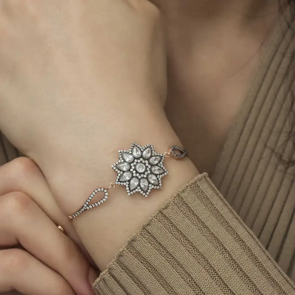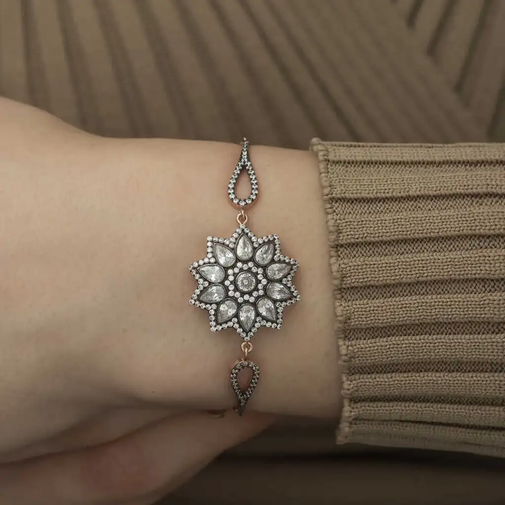 Gümüş Rose Çiçek Desenli Elmas Montür Bileklik