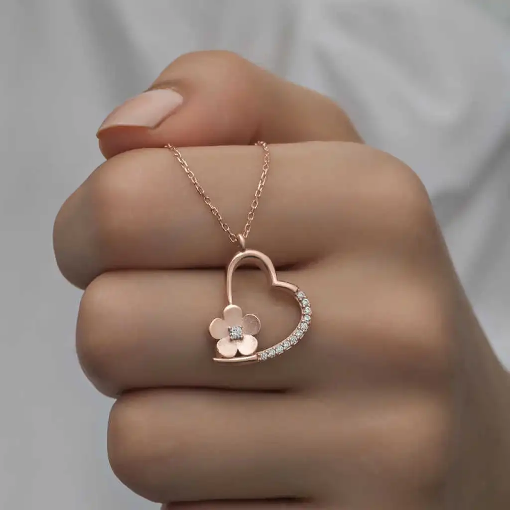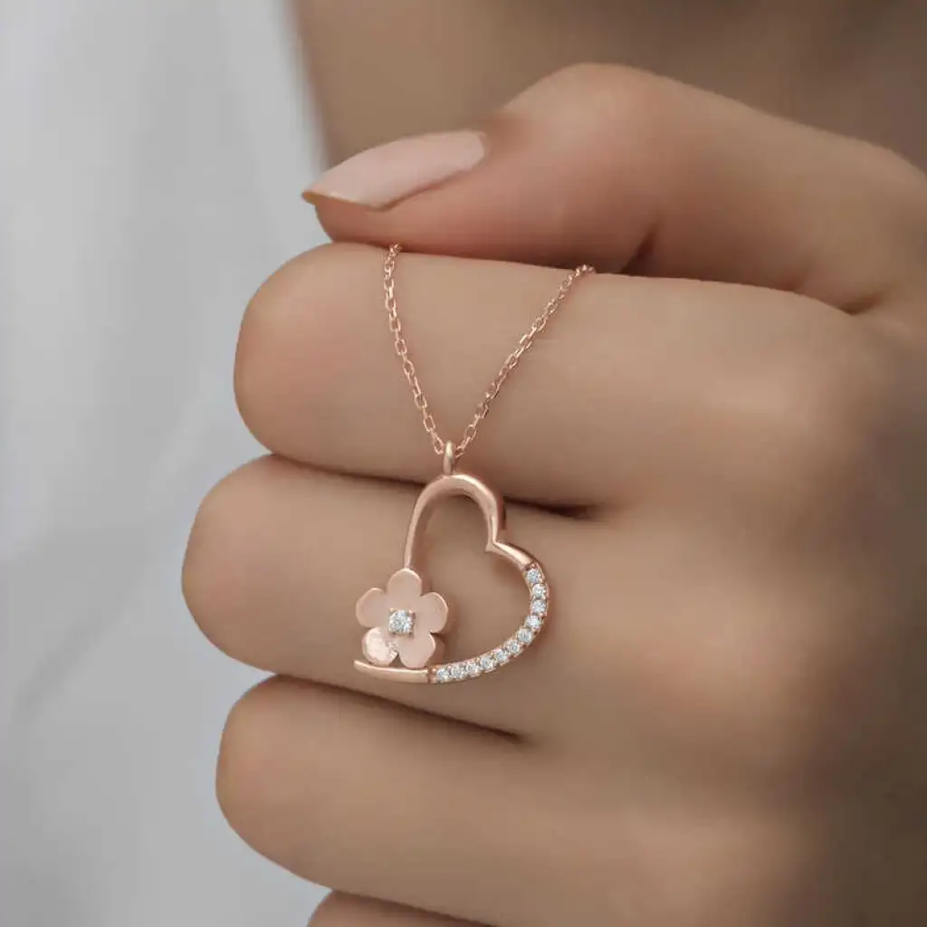 Kalp simgesi daima koşulsuz sevginin ve aşkın sembolü olmuştur. Dini öğretilerde ise kalbin gücü sınırsızdır. Çünkü kalp Yaradanın evi, bizim ise evrene açılan gerçeklik kapımızdır. Bu şık gümüş çiçekli kalp kolye; doğum günü hediyesi, sevgililer günü hediyesi veya annelere hediye olarak özel günlerde tercih edilebilecek mükemmel bir seçenektir. Gümüş çiçekli kalp kadın kolye 925 ayar gümüşten imal edilmiştir. Bu kolye üzerinde rose kaplama yapılmıştır. Rose kaplama yapılan gümüş kadın kolye modelleri parlaklığını uzun süre muhafaza eder. Üzerinde bulunan taşlar zirkondur. Tüm gümüş kadın kolye modellerimizde olduğu gibi gümüş çiçekli kalp kadın kolye modeli de el emeği ile üretilmiştir. Gümüş ve değerli taşlar nedeniyle belirtilen ortalama ürün ağırlığında ± %10 sapma olabilmektedir.
