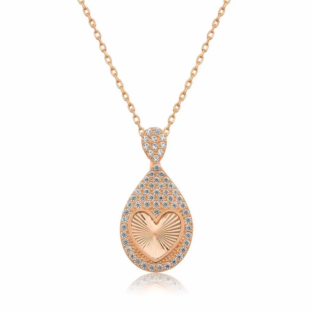 Kalp simgesi, daima koşulsuz sevginin ve aşkın sembolü olmuştur. Dini öğretilerde ise kalbin gücü sınırsızdır. Çünkü kalp Yaradanın evi, bizim ise evrene açılan gerçeklik kapımızdır. Gümüş damla kalp kolye sizi ve sevgilinizi temsil edecek en şık ve anlamlı kolyelerden biridir. Bu şık damla kalp bayan kolye; doğum günü hediyesi, sevgililer günü hediyesi veya annelere hediye olarak özel günlerde tercih edilebilecek mükemmel bir seçenektir. Gümüş zirkon taşlı damla kalp bayan kolye 925 ayar gümüşten imal edilmiştir. Bu kolye üzerinde rose kaplama yapılmıştır. Rose kaplama yapılan gümüş damla kalp bayan kolye modelleri parlaklığını uzun süre muhafaza eder. Üzerinde bulunan taşlar zirkondur. Tüm gümüş bayan kolye modellerinde olduğu gibi gümüş damla kalp bayan kolye modeli de el emeği ile üretilmiştir. Gümüş ve değerli taşlar nedeniyle belirtilen ortalama ürün ağırlığında ± %10 sapma olabilmektedir.