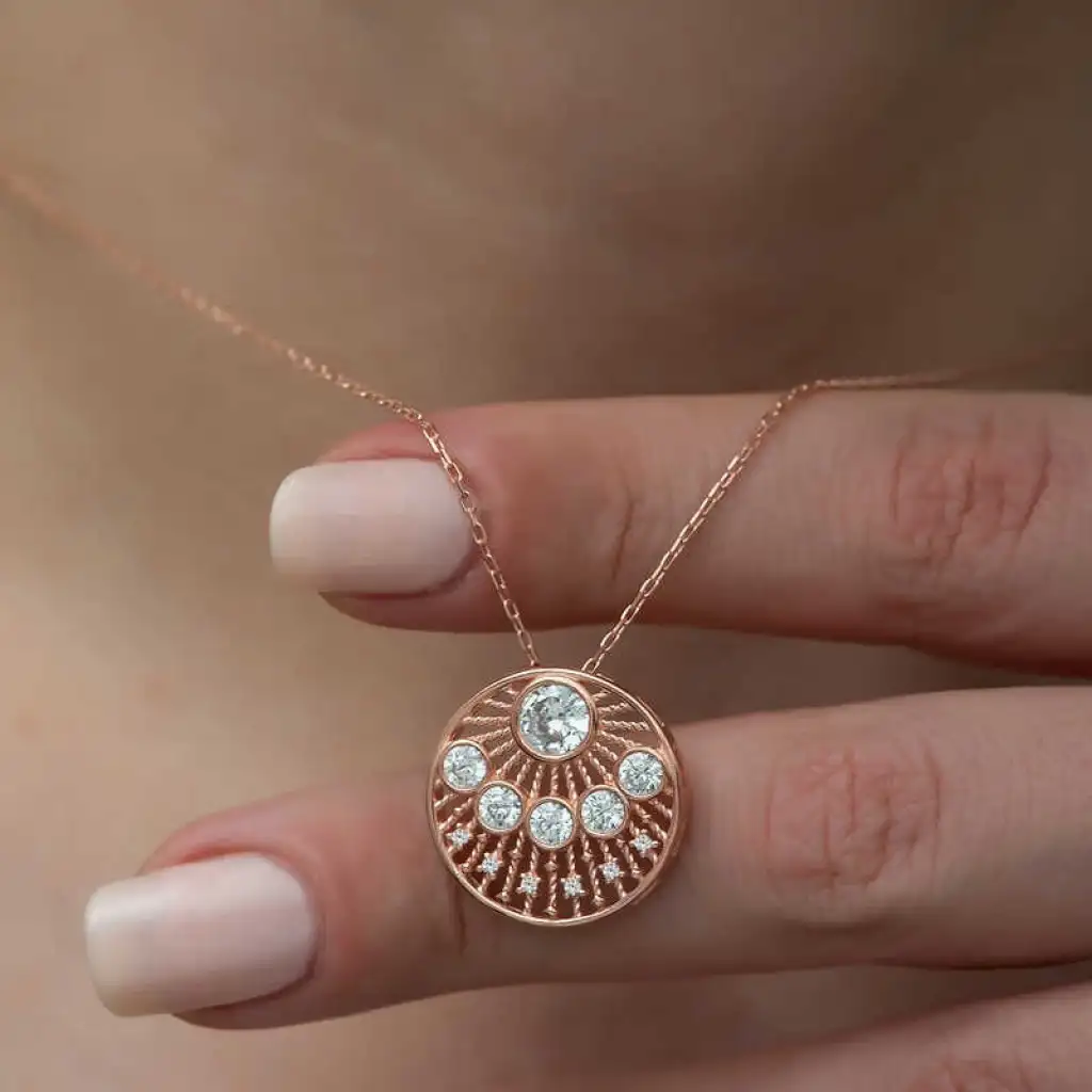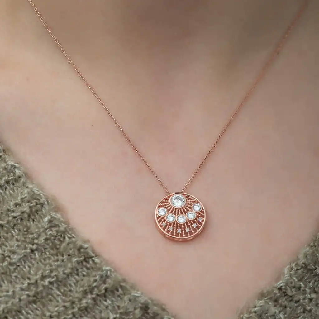 Beyaz zirkon taşlar ile süslenmiş etnik desenli bayan kolye, şık ve ışıltıyı sevenler için tasarlandı. Günün her anında severek kullanabileceğiniz, herkesin beğenisini toplayabilecek ve göz kamaştırabilecek bir üründür. Gümüş etnik desenli bayan kolye 925 ayar gümüşten imal edilmiştir. Bu kolye üzerine rose altın kaplama yapılmıştır. Rose altın kaplama yapılan ürünler parlaklığını uzun süre muhafaza eder ve gümüşü bakır rengine dönüştürür. Üzerinde bulunan taşlar zirkon'dur. Tüm gümüş bayan kolye modellerinde olduğu gibi gümüş etnik desenli bayan kolye modeli de el emeği ile üretilmiştir. Gümüş ve değerli taşlar nedeniyle belirtilen ortalama ürün ağırlığında ± %10 sapma olabilmektedir.Ürünlerimizin tamamı el emeği ile üretilmiştir.