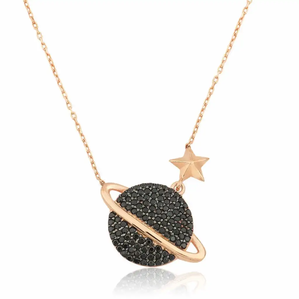 Gezegenlerin güneşin etrafında döndüğü gibi bütün varlığın; ayın, yıldızların da aşkınızın etrafında dönmesine ne dersiniz? Bu zariflikten yola çıkılarak tasarlanan kolye; doğum günü hediyesi, sevgililer günü veya annelere hediye olarak özel günlerde tercih edilebilecek mükemmel bir seçenektir. Kolye 925 ayar gümüşten üretilmiştir. Gümüş kolyenin zincir uzunluğu 45 cm’dir. Gümüş üzerine rose altın kaplama yapılmıştır. Rose kaplama yapılan bayan kolyeler parlaklığını uzun süre muhafaza eder, gümüş rengini pembe renge dönüştürür ve oksitlenmeyi geciktirir. Tüm gümüş kolyelerde olduğu gibi gümüş gezegen bayan kolye de el emeği ile üretilmiştir. Üzerinde bulunan taşlar zirkondur. Gümüş ve değerli taşlar nedeniyle belirtilen ürün ağırlığında ± %10 sapma olabilmektedir.