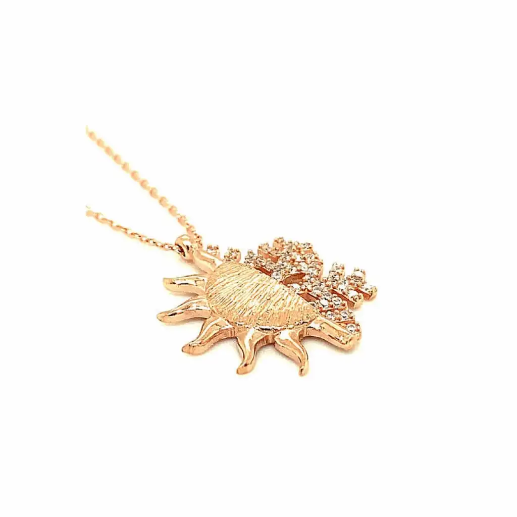 Güneş; ışığın, bilginin, iyiliğin, gücün ve yönetimin sembolüdür. Bu ışıl ışıl ve farklı tasarımıyla göz kamaştıran kolye; 925 ayar gümüşten imal edilmiştir. Gümüş üzerine rose kaplama yapılmıştır. Rose kaplama yapılan gümüş ürünler parlaklığını uzun süre muhafaza eder, oksitlenmesi gecikir. Gümüş güneş kartanesi bayan kolye üzerinde bulunan taşlar zirkon'dur. Tüm gümüş kolyelerde olduğu gibi gümüş güneş bayan kolye de tamamı el emeği ile üretilmiştir. Gümüş ve değerli taşlar nedeniyle belirtilen ortalama ürün ağırlığında ± %10 sapma olabilmektedir.