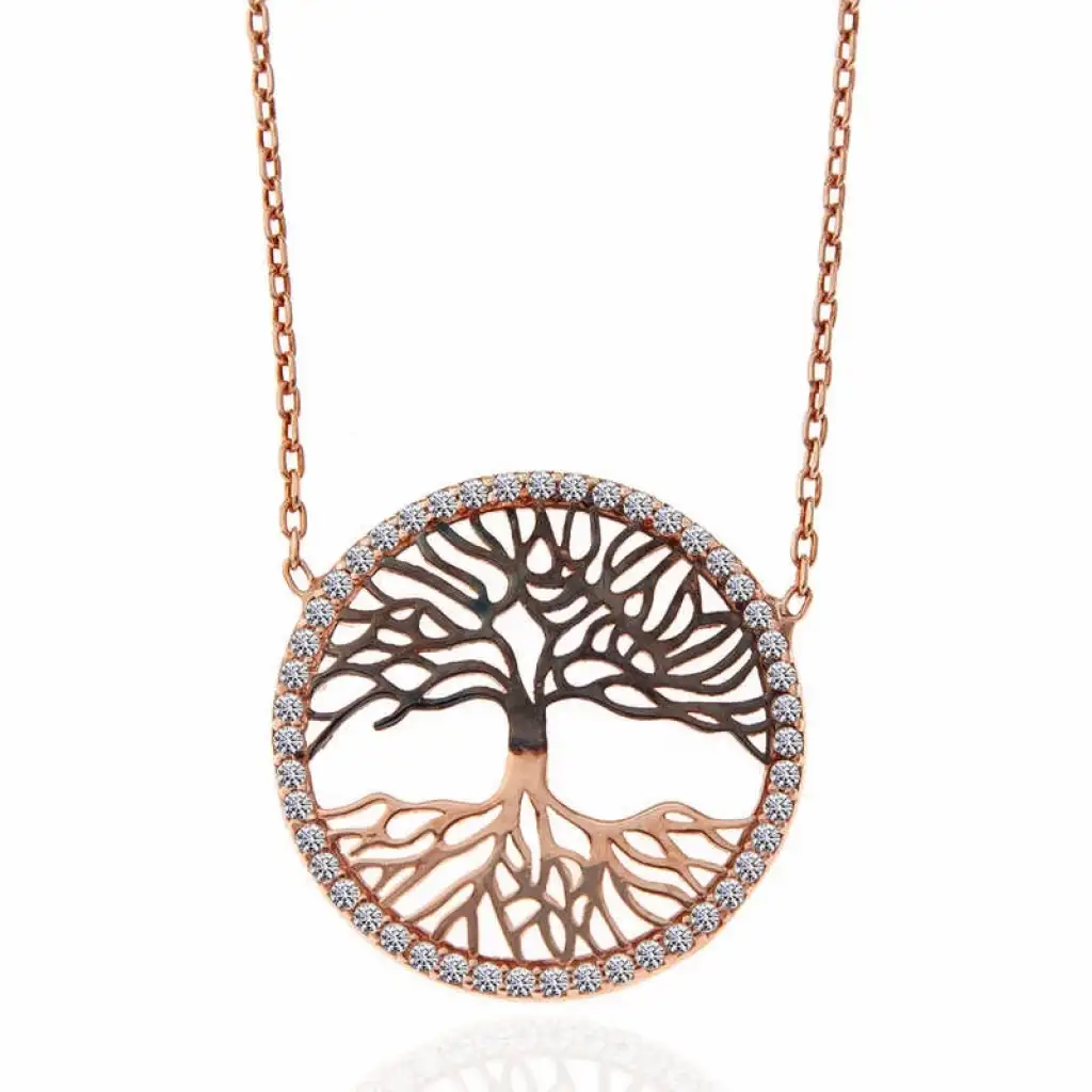 Hayat ağacı yeni bir yaşamı sembolize ediyor. Bunun yanında dünyada iz bırakmak, soyunu devam ettirme amacı yani ailenin simgesi anlamına gelmektedir. Bu şık kolye; 925 ayar gümüşten imal edilmiştir. Gümüş üzerine rose kaplama yapılmıştır. Rose kaplama yapılan ürünler parlaklığını uzun süre muhafaza eder ve oksitlenmeyi geciktirir. Tüm gümüş kadın kolyelerde olduğu gibi gümüş hayat ağacı kadın kolye de el emeği ile üretilmiştir. Gümüş ve değerli taşlar nedeniyle belirtilen ürün ağırlığında ± %10 sapma olabilmektedir
