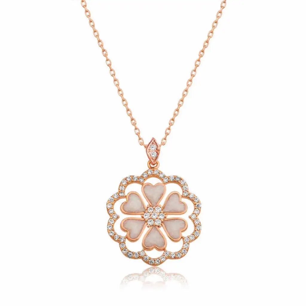 Kalpli yapraklardan oluşan şık çiçek desenli gümüş kolye modeli severek kullanabileceğiniz ve sevdiklerinize armağan edebileceğiniz hoş bir aksesuardır. Kalp yapraklı çiçekten oluşan özel tasarım bayan kolye modeli 925 ayar gümüşten imal edilmiştir. Bu zarif kolye genç aşıkların özel günlerde tercih edebileceği çok şık bir seçenek olacaktır. Bu özel kolye ile sevdiğinizin boynunu aşkla süsleyin. Gümüş kalp çiçek bayan kolye modeli üzerinde rose altın kaplama ve beyaz sedefli mine bulunmaktadır. Rose altın kaplama yapılan gümüş bayan kolye modelleri parlaklığını uzun süre muhafaza eder. Gümüş kalp çiçek bayan kolye sizin olduğu kadar sevdiklerinizin de keyifle takacağı en güzel hediyelerden biri olacaktır. Tüm gümüş bayan kolye modellerimizde olduğu gibi gümüş kalp çiçek bayan kolye de el emeği ile üretilmiştir. Gümüş ve değerli taşlar nedeniyle belirtilen ortalama ürün ağırlığında ± %10 sapma olabilmektedir.